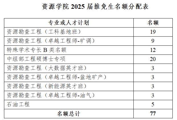根据《中国地质大学(武汉)2025届本科毕业生推荐免试攻读研究生工作方案》,我院2025届推免生名额分配如下:
