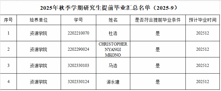 根据学校的相关通知要求,经研究生个人申请,学院初审,资源学院2023级硕士研究生(不含硕博连读、提前攻博研究生)、2022级博士研究生(不含直博生)、2020级直博生申请提前毕业名单如下,如有异议,请公示期内书面反馈意见至研究生科(联系人:周老师,办公室:主楼336,电话:67883627),公示期即日起至2025年9月22日。