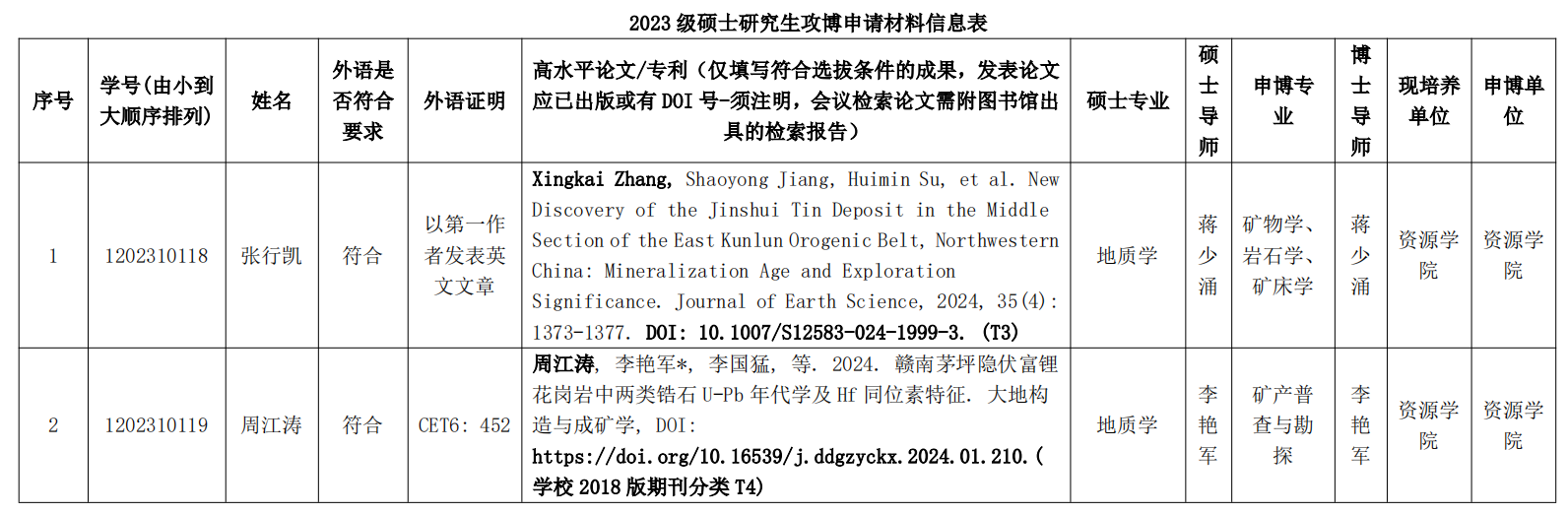 经硕士研究生个人申请、导师推荐和学院初审,资源学院2023级硕士研究生申请提前攻读博士学位拟推荐名单公示如下。如有异议请公示期内书面反馈意见至学院研究生科(336室)。联系人:赵老师,电话:67883627。