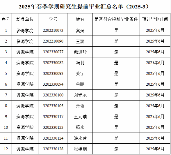 根据学校的相关通知要求,经研究生个人申请,学院初审,资源学院2023级硕士研究生(不含硕博连读、提前攻博研究生)、2022级博士研究生(不含直博生)、2020级直博生申请提前毕业名单如下,如有异议,请公示期内书面反馈意见至研究生科(联系人:周老师,办公室:主楼336,电话:67883627),公示期即日起至2025年3月2日。