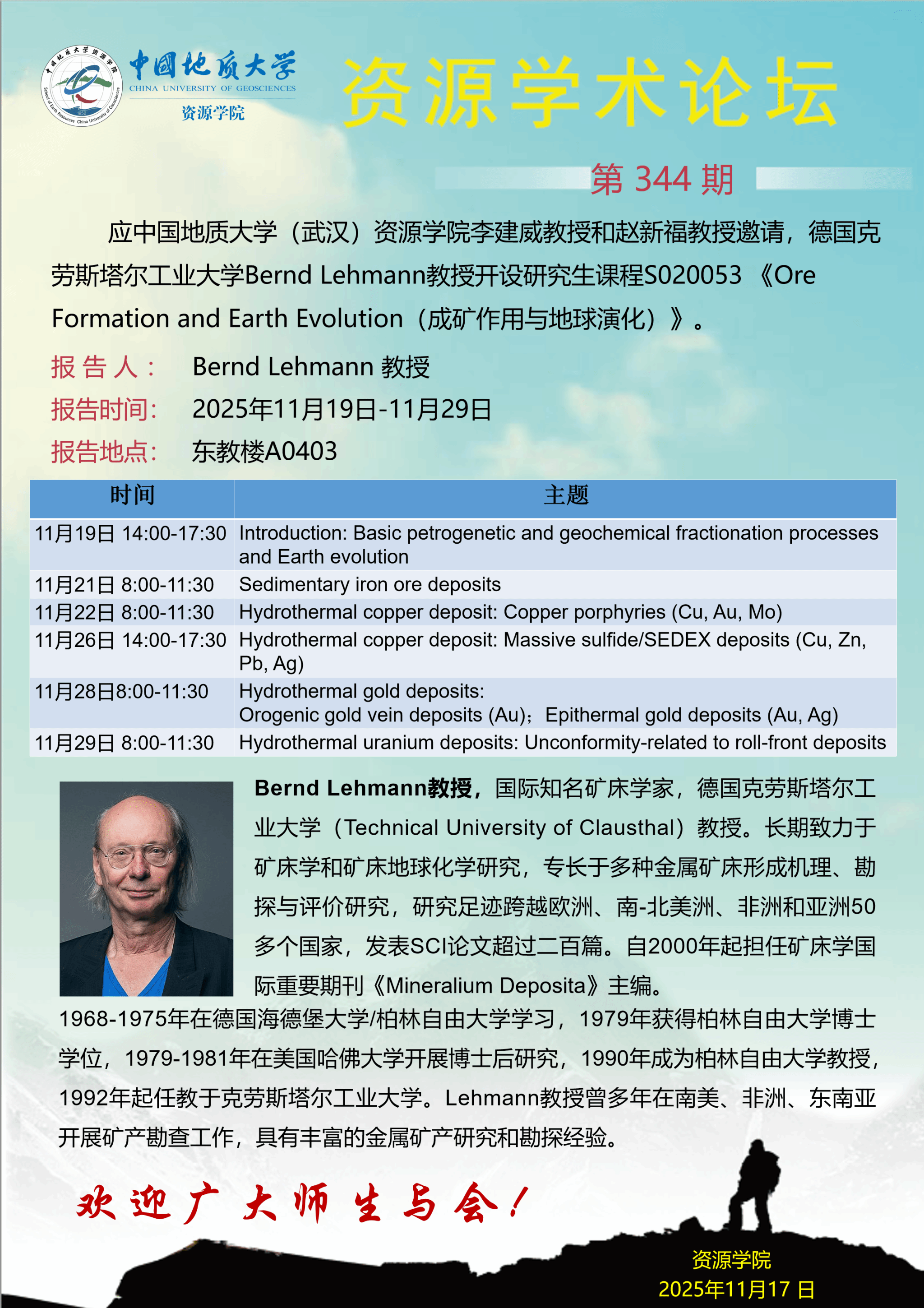 【11月19日-11月29日】第344期资源学术论坛:Bernd Lehmann学术报告