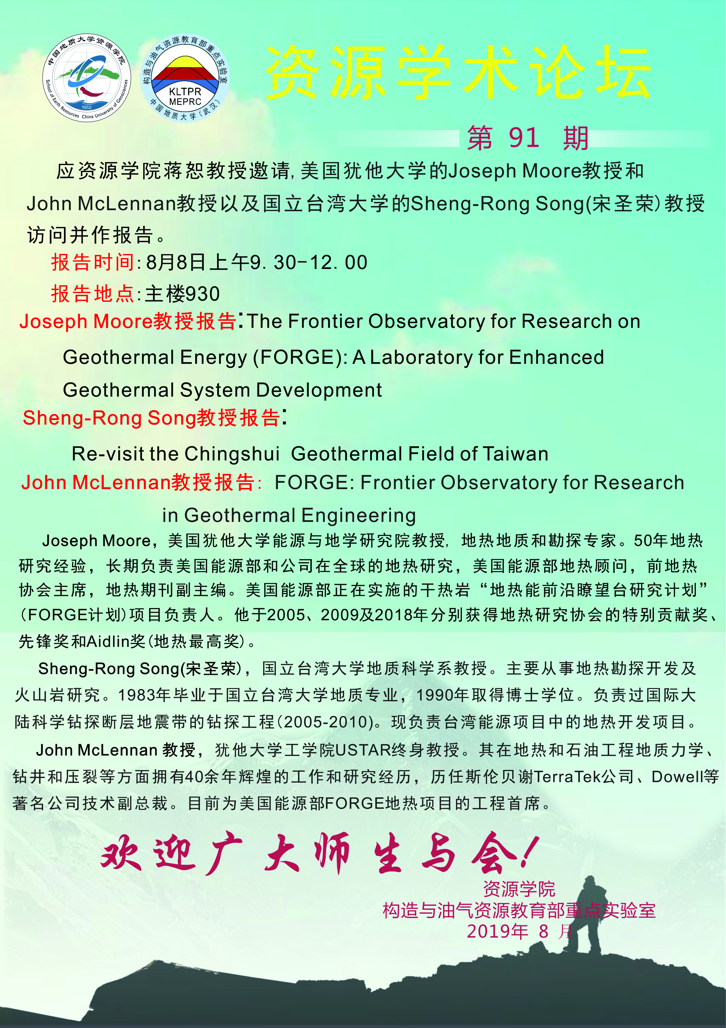 【8月8日】第91期资源学术论坛:Joseph Moore, Sheng-Rong Song, John McLennan学术报告