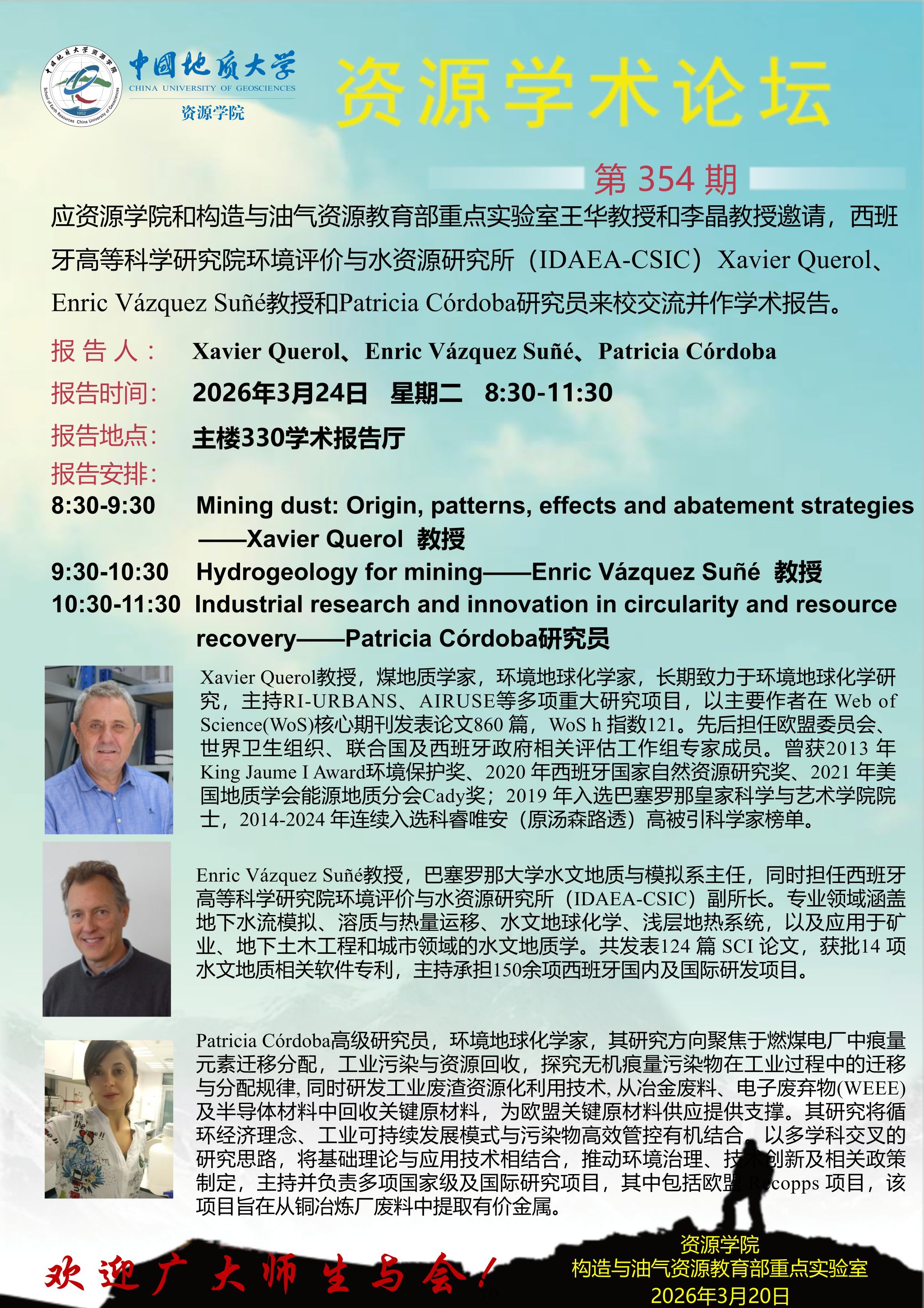 【3月24日】第354期资源学术论坛:Xavier Querol、Enric Vázquez Suñé、Patricia Córdoba学术报告