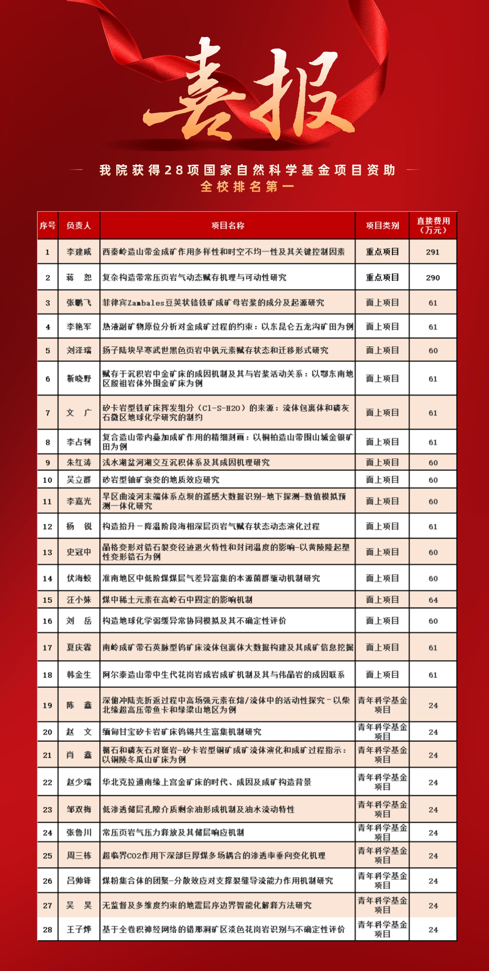 共有28个项目获得立项资助,再次刷新资助纪录。其中,重点项目2项、面上项目16项、青年科学基金项目10项,直接资助费用共计1793万元。