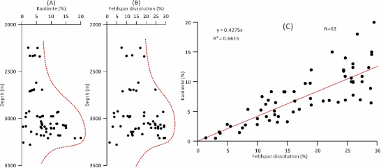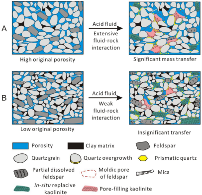 论文以鄂尔多斯盆地北部杭锦旗地区二叠系下石盒子组(P2x)致密气砂岩储层为研究对象,精细表征研究区致密砂岩储层主要成岩产物的岩相学特征,包括高岭石、石英和碳酸盐的沉淀、碎屑长石的溶解和粘土矿物转化,深入揭示自生高岭石的成因和分布模式,评价高岭石胶结作用对研究致密砂岩储层质量的影响。根据薄片鉴定与图像分析,P2x砂岩中主要发育两种形式的自生高岭石(图1):(1)粒间孔隙充填高岭石(pore-filling kaolinite);(2)原地交代沉淀的高岭石(in-situ replacive kaolinite)。依据溶蚀沉淀方程与质量平衡计算表明,杭锦旗下石盒子组致密砂岩中自生高岭石和长石溶蚀孔隙度之间具有良好的线性相关性,1体积的钾长石溶解可释放约0.4体积的自生高岭石。因此,可以认为钾长石溶蚀产生的硅和铝为自生高岭石的沉淀提供了重要的物质来源(图2)。