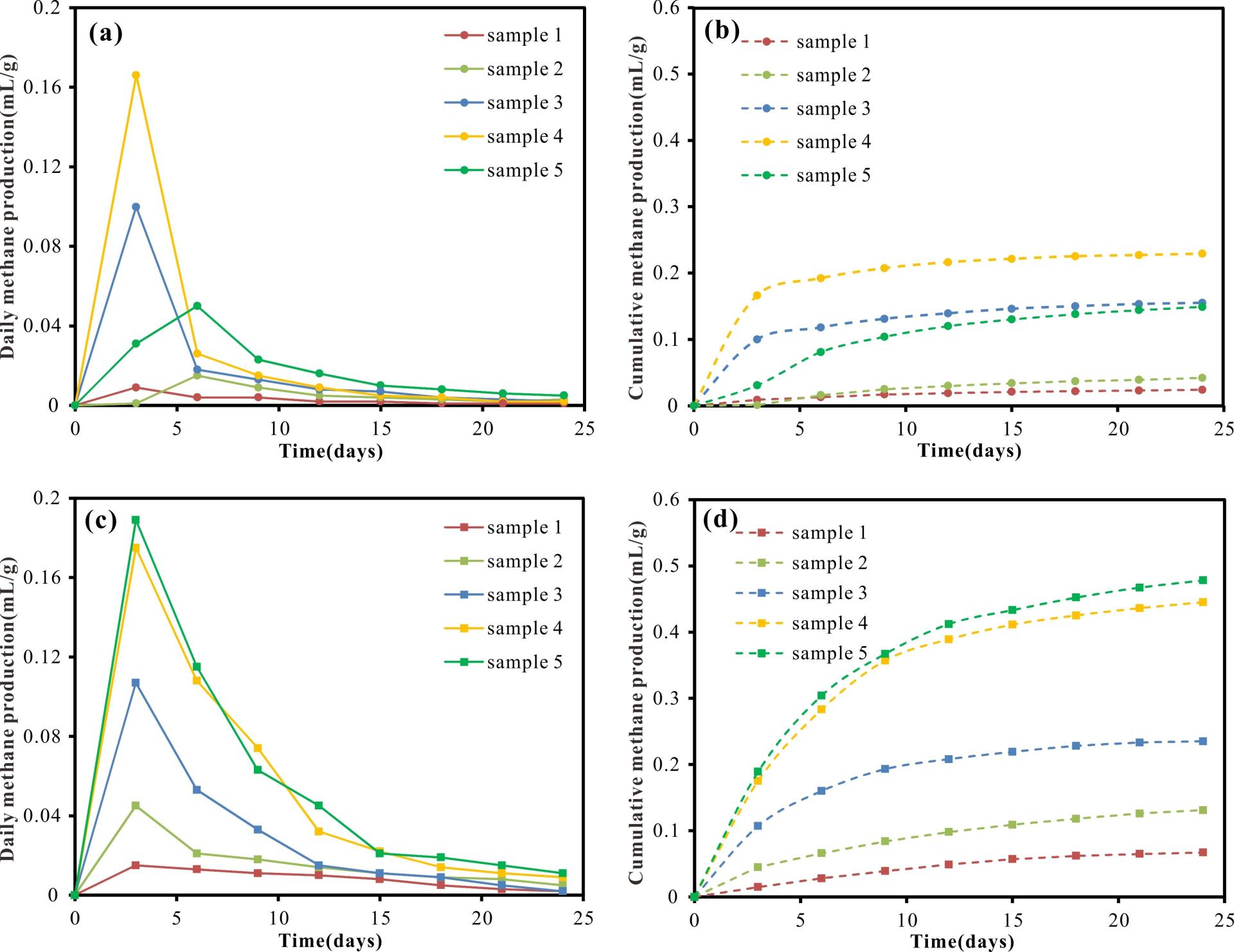 图1 未经低矿化环境培养前样品的阶段产甲烷量(a)与累计产甲烷量(b);低矿化度条件连续培养四代后样品的阶段产甲烷量(c)与累计产甲烷量(d)