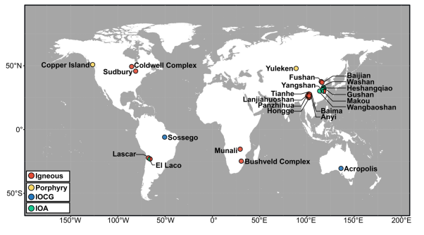 资源学院2021届硕士毕业生胡斌和博士后曾丽平,在导师赵新福教授指导下,收集了全球典型高温成矿系统,包括岩浆成因矿床(钒钛磁铁矿、铜镍硫化物矿床)、高温热液矿床(斑岩铜矿、IOCG矿床)、IOA矿床及相关的岩浆岩中已发表的原生高钛磁铁矿的LA-ICP-MS元素数据(图1),对数据集进行了两种无监督方法(主成分分析[PCA]和t分布随机邻域嵌入[t-SNE])的机器学习分析,通过大数据统计分析和建立机器学习模型,建立了不同成因高钛磁铁矿的微量元素组成特征。