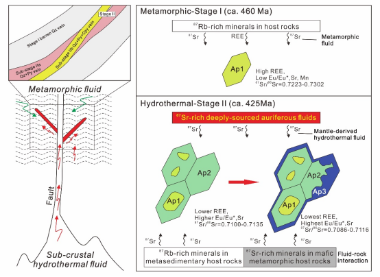 最近,中国地质大学(武汉)资源学院和紧缺战略矿产资源协同创新中心蒋少涌教授团队的马盈博士,利用磷灰石“矿物探针”的方法,结合多种高精度微区分析手段,对位于我国华夏地块武夷山成矿带的双旗山造山型金矿床中的磷灰石开展了精细的微区结构-元素-Sr同位素研究,取得如下主要认识: