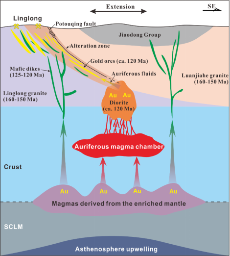 近年来华北克拉通胶东地区深部找矿勘查工作取得一系列重要突破,新增黄金资源量超过2000吨。其中玲珑矿田深部钻探工程在地表2000m以下揭露出发育浸染状黄铁矿的闪长岩,平均含金0.32克/吨(局部达7.59克/吨)。中国地质大学(武汉)李建威教授团队以玲珑矿田谢家含矿闪长岩和破头青断裂含矿蚀变岩为研究对象,系统开展了成岩-成矿年代学、岩石地球化学、矿床地球化学等研究工作,厘定出谢家闪长岩侵位、闪长岩金矿化以及破头青断裂金矿化均发生于120 Ma左右(图1),查明闪长岩岩浆起源于富集岩石圈地幔,揭示玲珑矿田金矿化的成矿流体与成矿物质主要来源于以闪长岩为代表的岩浆活动(图2)。研究成果证实了华北克拉通破坏峰期的巨量金矿化与幔源岩浆作用密切相关,阐述了岩浆演化、流体出溶及矿质沉淀的过程,并强调了富集地幔和构造活动对胶东地区爆发性金成矿的关键作用。此外,研究成果提出的成矿模式对认识类似构造背景下(古老克拉通发生破坏或改造作用)金矿床的成因有一定借鉴意义,如北美克拉通西部的内华达州卡林型金矿床。