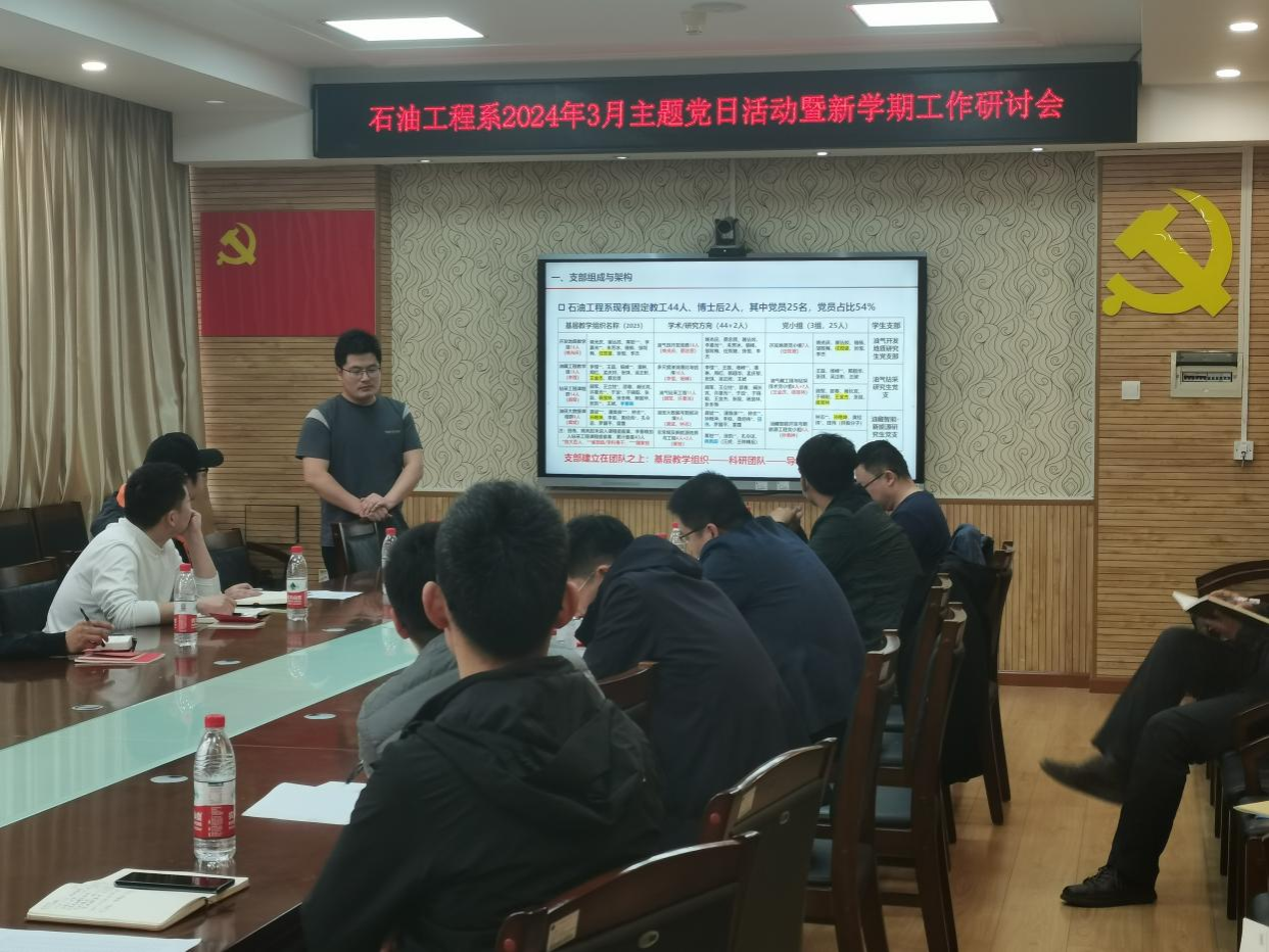 (通讯员 孙艳坤)3月28日,资源学院石油工程系党支部开展2024年3月主题党日活动和新学期工作研讨,会议主题为“学习全国两会精神,砥砺奋进担当作为——直面问题、勠力同心,推动石油工程学科建设”。石油工程系全体教师、学生党支部书记参加会议。支部书记张恒主持会议。