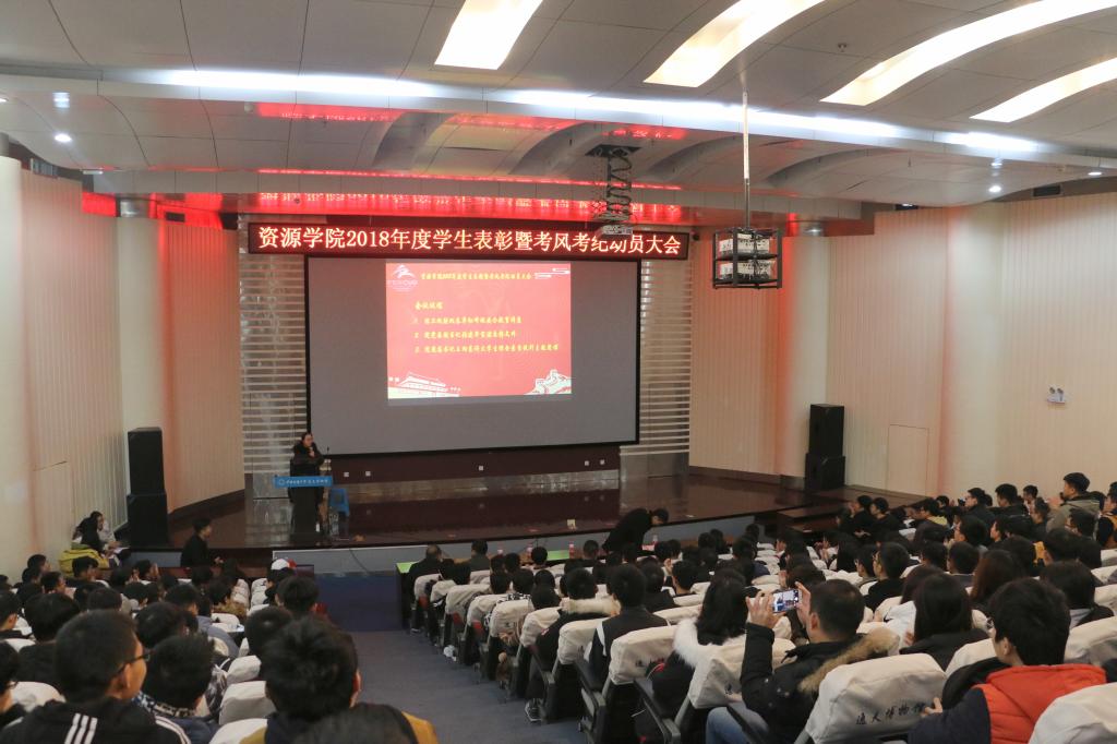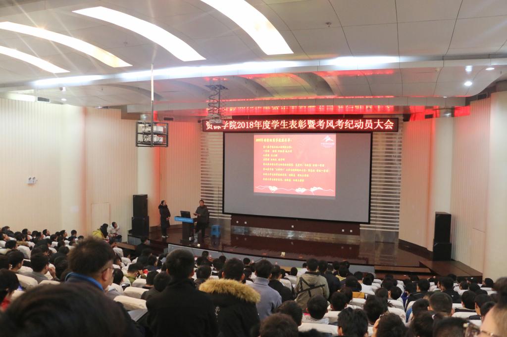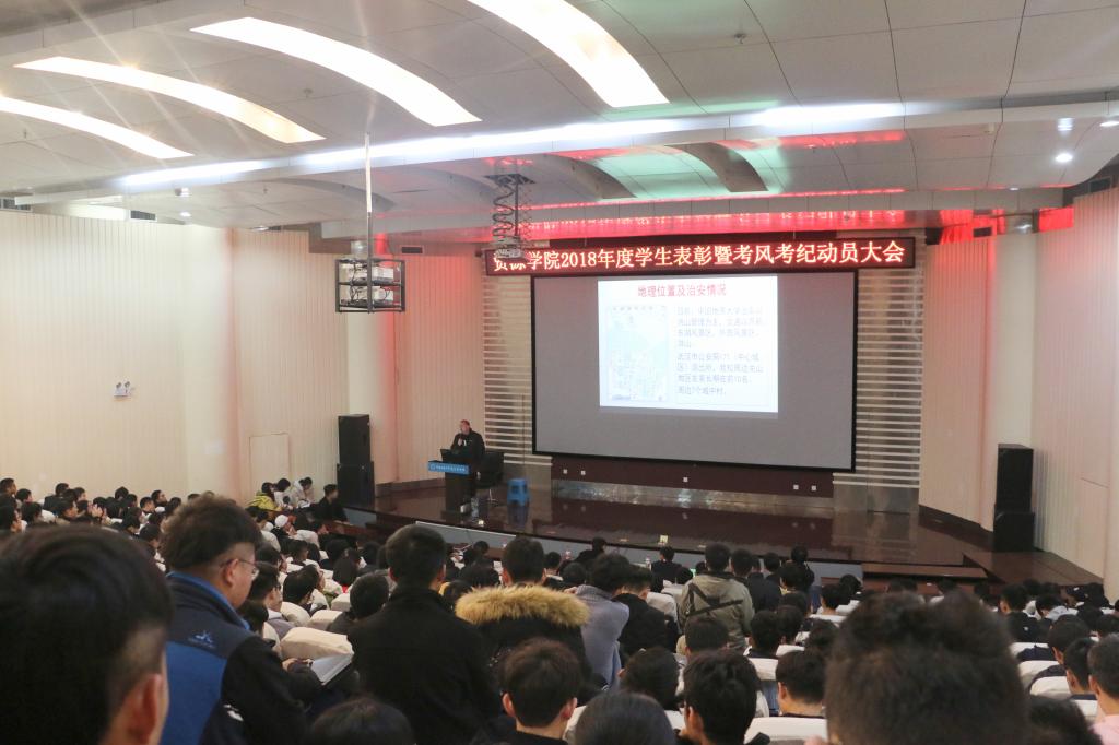 2018年学生表彰暨考风考纪动员大会于12月20日下午在博物馆报告厅召开。保卫处副处长单红峰、院党委副书记张建华、院团委书记王向东、学工辅导员刘明辉、史邵贤和蒋钰鑫以及300余名本科生参加此次会议。刘明辉主持会议。