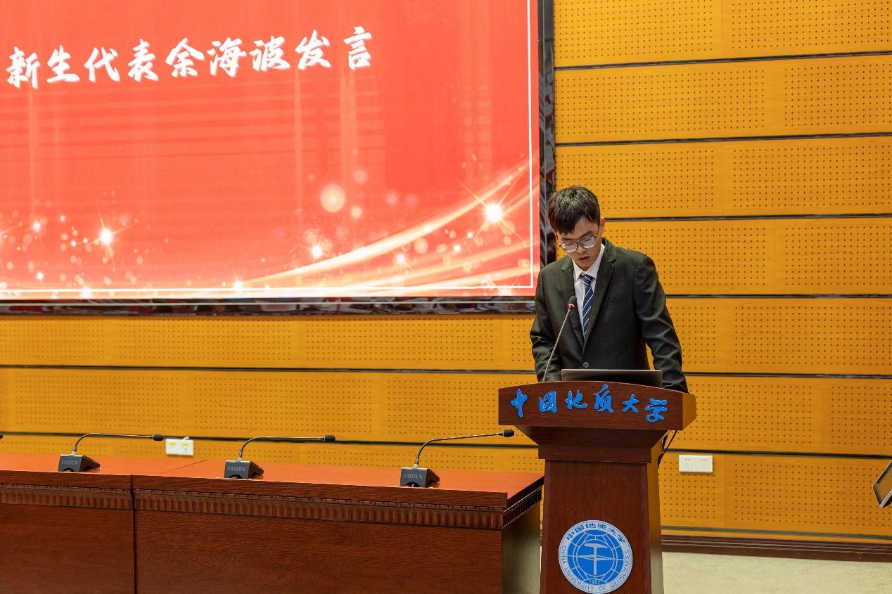 新生代表余海波同学发言。他倡议同学们要继承老一辈地大人、资源人的昂扬斗志,践行“艰苦朴素 求真务实”校训精神,把握好最美青春年华,用不懈努力在资源学院续写出最美的人生篇章。