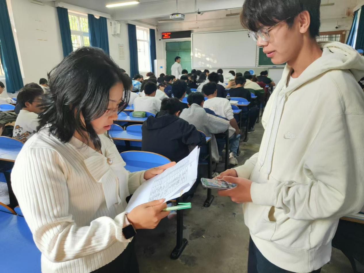 为检查和了解学生入学以来的学习情况,帮助同学们查缺补漏,11月3日晚,资源学院学生会学习部在东区教学楼组织2024级本科生第一次月考,助理班主任、驻班党员担任监考员,考试科目为高等数学和大学英语。