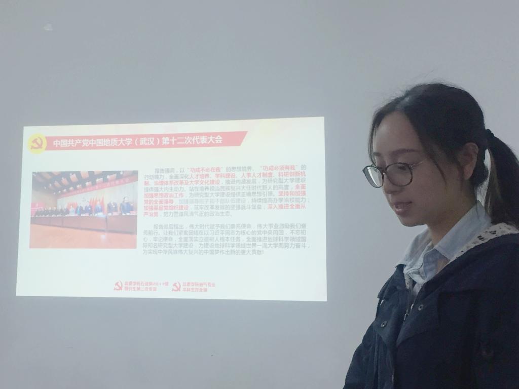 石油系2017级研究生第二党支部书记程璇同志带领大家一起学习了我校第十二次党代会精神,包括会议主题、会议报告提纲以及提出的奋斗目标等内容,并提出与会党员应充分发挥先锋模范作用,为建校一百年时实现“建成地球科学领域世界一流大学”的地大梦添砖加瓦。