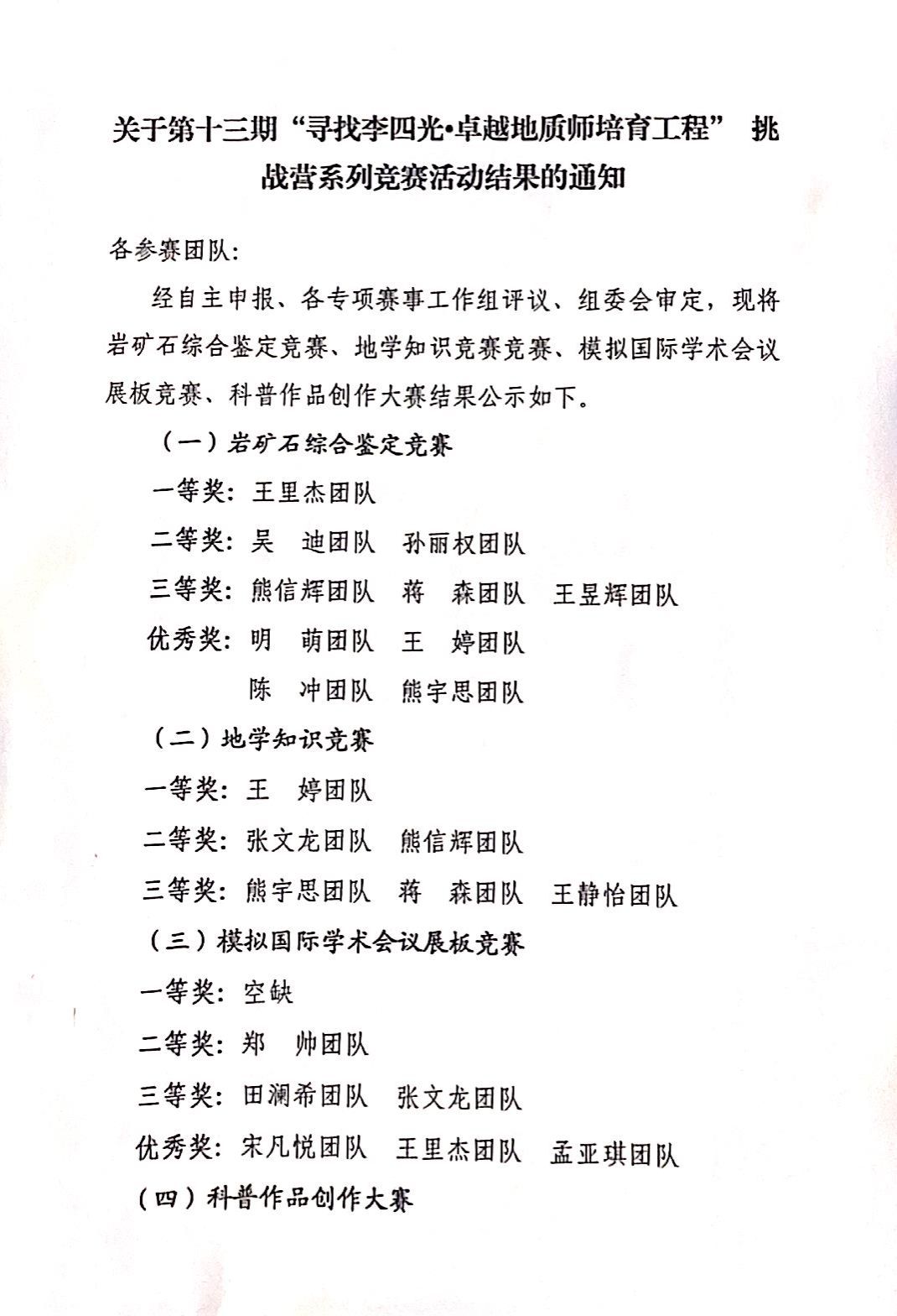关于公布第十三期“寻找李四光•卓越地质师培育工程” 挑战营系列竞赛活动结果的通知