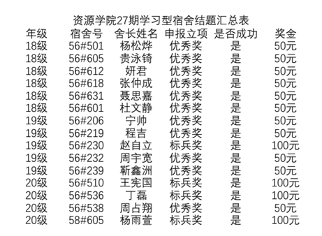 学习型宿舍建设是学院的重点工作。为持续深化卓越学风建设,打造乐学尚学宿舍文化氛围,资源学院学生会启动第26期学习型宿舍结题工作。经审核,以下宿舍结题成功,现将结题结果公示如下: