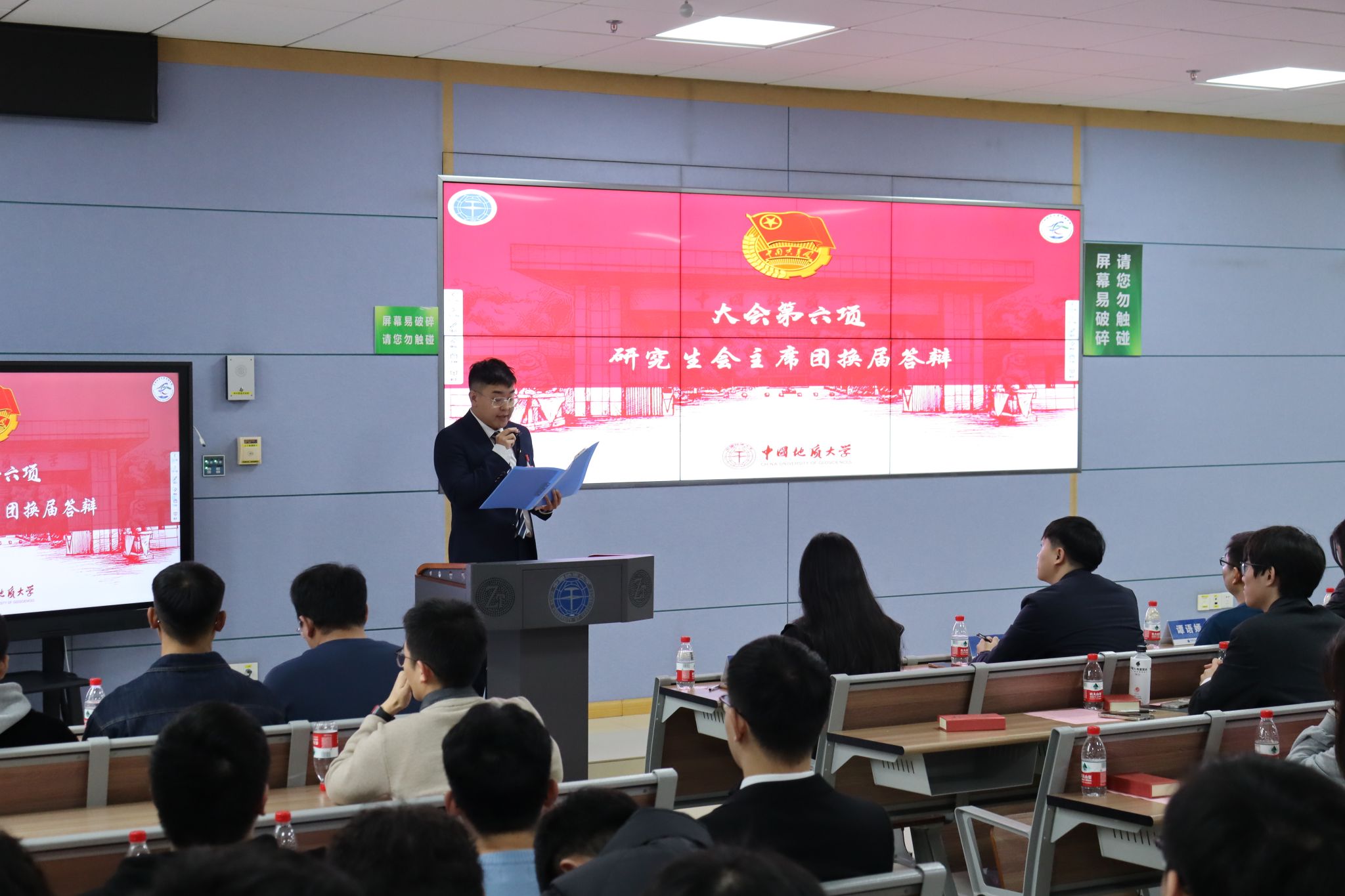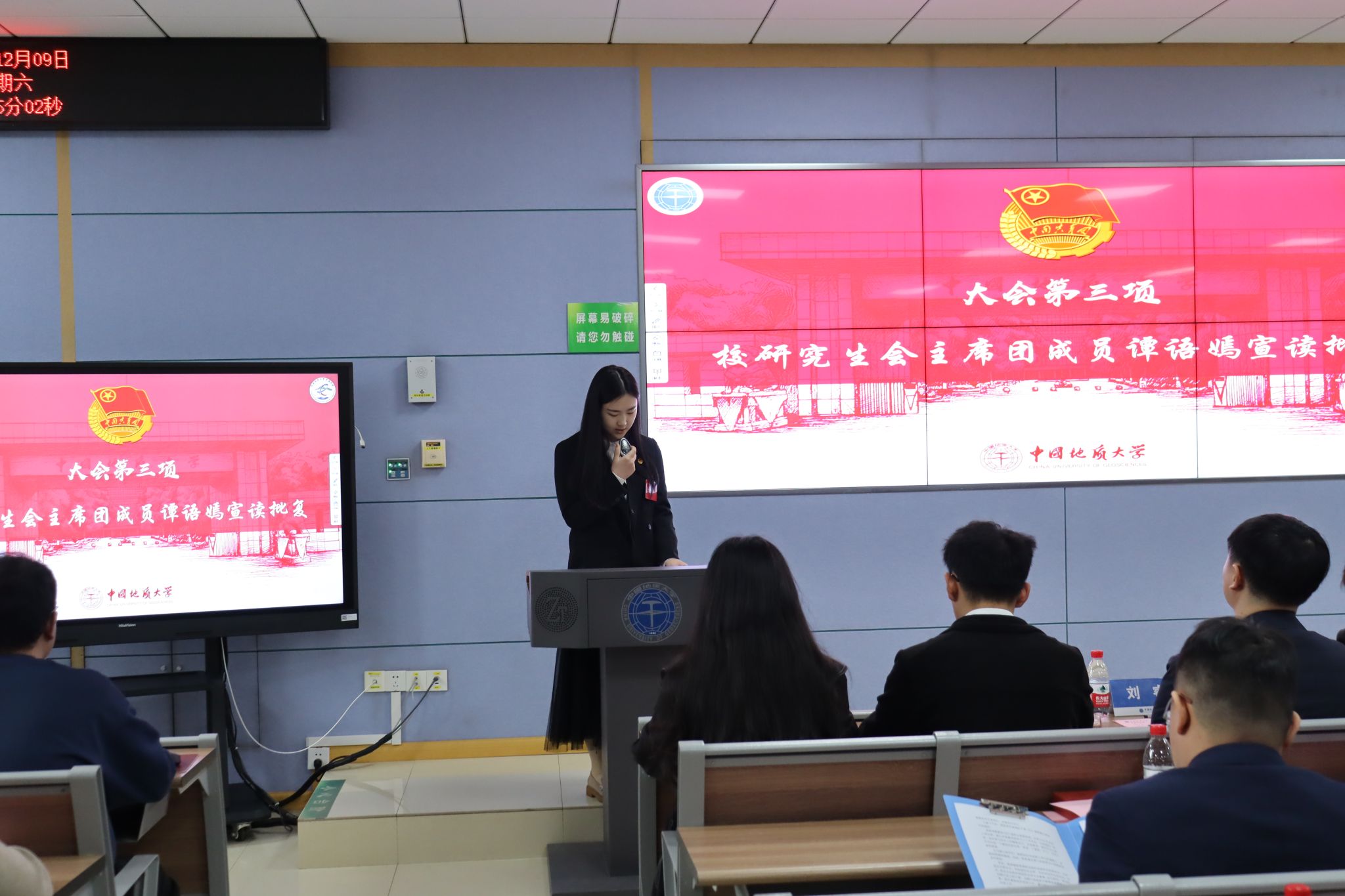 谭语嫣宣读《关于同意召开中国地质大学(武汉)资源学院第十二次研究生代表大会的批复》。