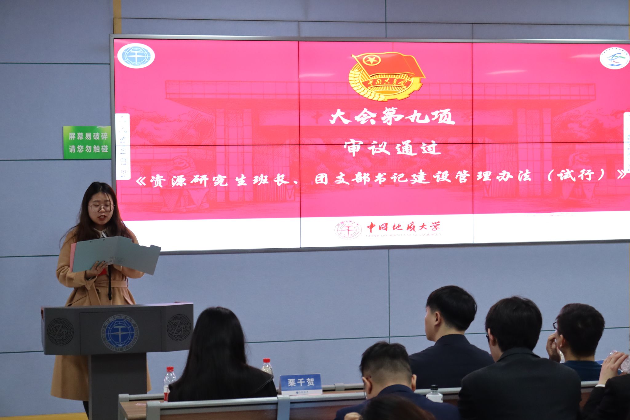 大会听取了题为《深化改革促创新 担当使命共发展—团结带领广大研究生为建成资源能源领域一流研究型学院而团结奋斗》2022届研究生会工作报告,审议并通过了《资源学院研究生班长、团支部书记建设管理办法(试行)》。