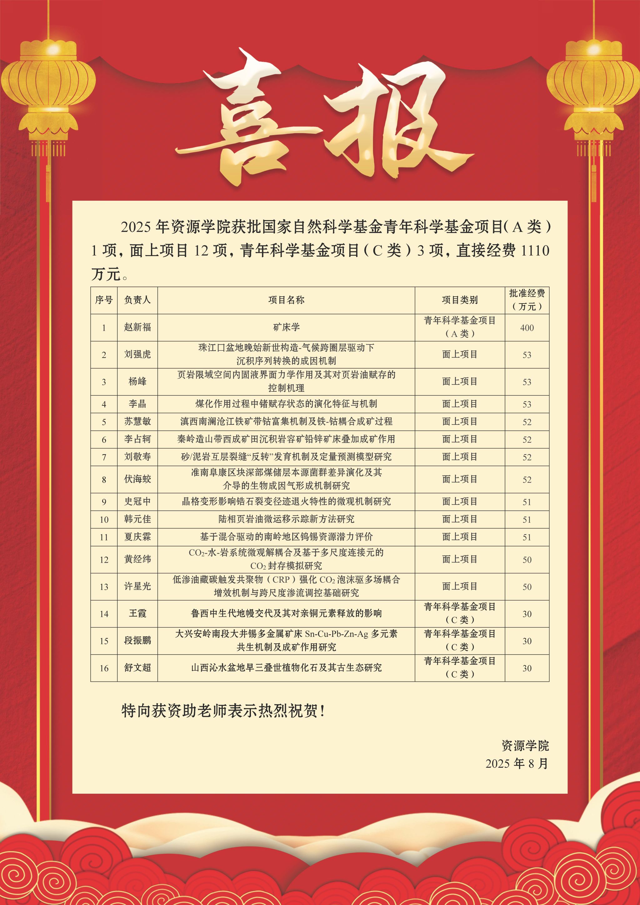 8月27日,国家自然科学基金委员会公布了2025年集中接收期项目评审结果,资源学院获批资助项目共16项。其中,青年科学基金项目(A类)1项,面上项目12项,青年科学基金项目(C类)3项。项目直接经费达1110万元,较2024年增长63.2%,经费数量位居全校第二。