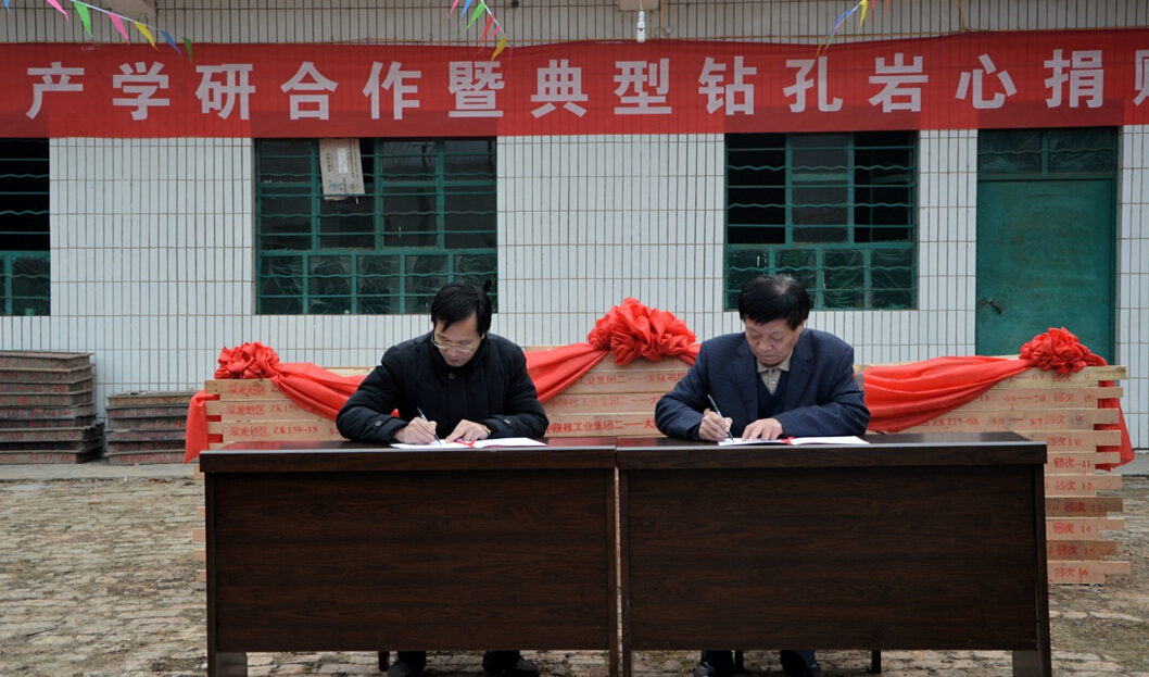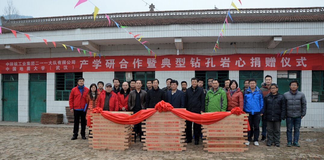 2015年12月8日,我校校友与社会合作处兰廷泽处长和资源学院石万忠副院长,率《聚煤盆地沉积学》和《含煤岩系伴生矿产》教学组核心成员,赴铀矿整装勘查区现场参加了简单的岩芯捐赠协议签字和交接仪式。期间,二一一大队王仲铎队长(兼总工)简要总结了与地大盆地铀资源研究团队的成功合作经历,充分肯定了我校在双龙铀矿找矿突破中所起到的重要科研支撑作用和对二一一大队一线工程技术人员的培养,他衷心祝愿中地大与二一一大队共建而相助,合作而共赢,发展而互撑,协同而共谋。兰廷泽处长代表学校签署了捐赠协议,并高度赞扬了二一一大队对学校教学实践、科研工作和学科建设等方面的大力支持。双方约定,将进一步加强合作,通过教学研究,像“考古”那样让“石头”会说话,让珍贵的岩芯标本发挥重要的教学实践功能。