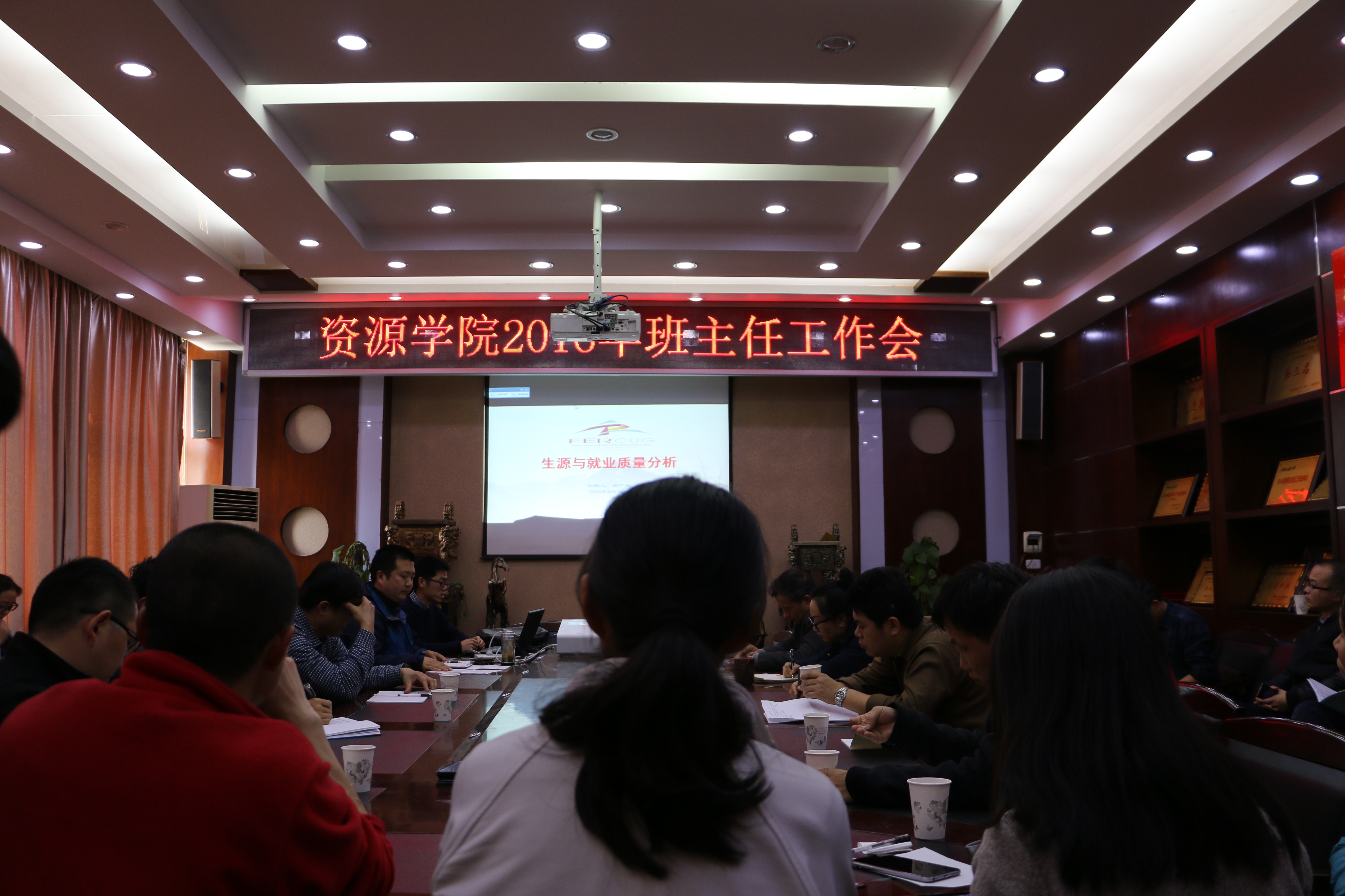 院团委书记吴仁喜、2015级辅导员刘明辉和2014级辅导员王向东分别向与会人员做了题为《资源学院2015年度生源与就业质量分析》、《资源学院2015年度本科生学情分析》和《资源学院2015年度班主任工作情况调查报告》的专题汇报。