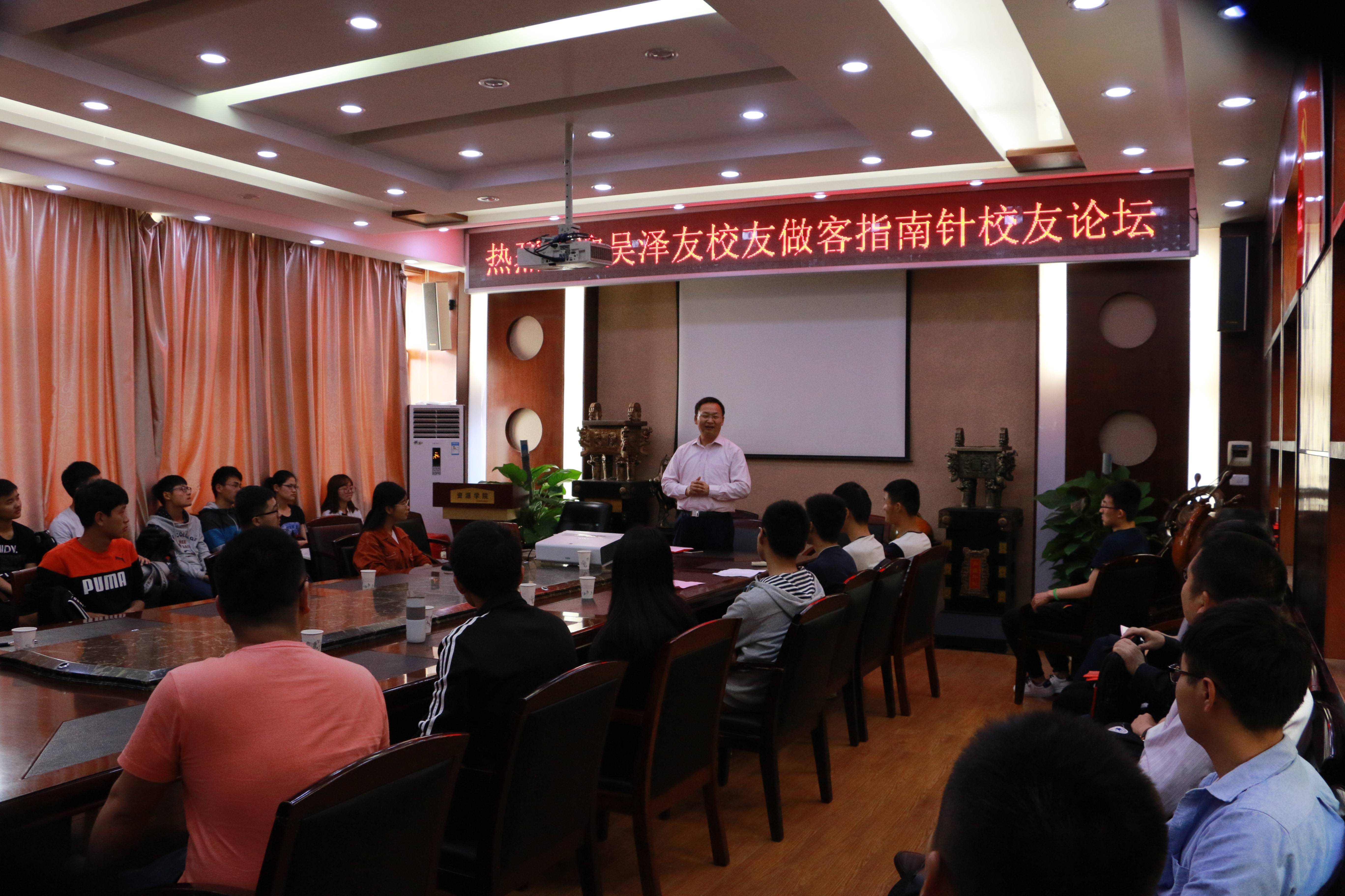 捐赠仪式结束后,吴泽友做客“指南针”校友论坛,与师弟师妹共话成长。他以“大学生综合素质培养”为主线,勉励师弟师妹们树立远大理想,学会人际交往,培养团队精神,锻造自强不息、顽强拼搏的“武气”,文武兼备,全面发展。整个分享过程中掌声不断,师弟师妹听得认真,记得细致,对大学的综合素质培养有了一个更加深入的认识,可谓受益匪浅。