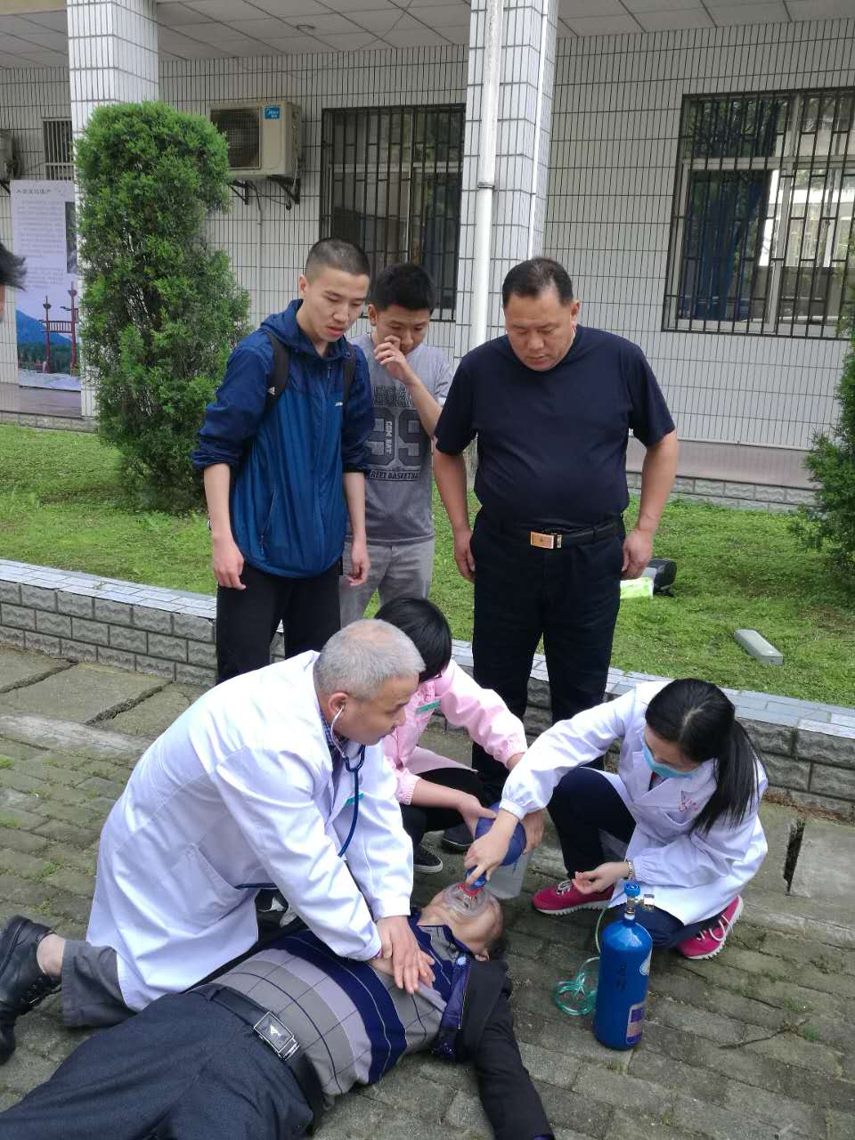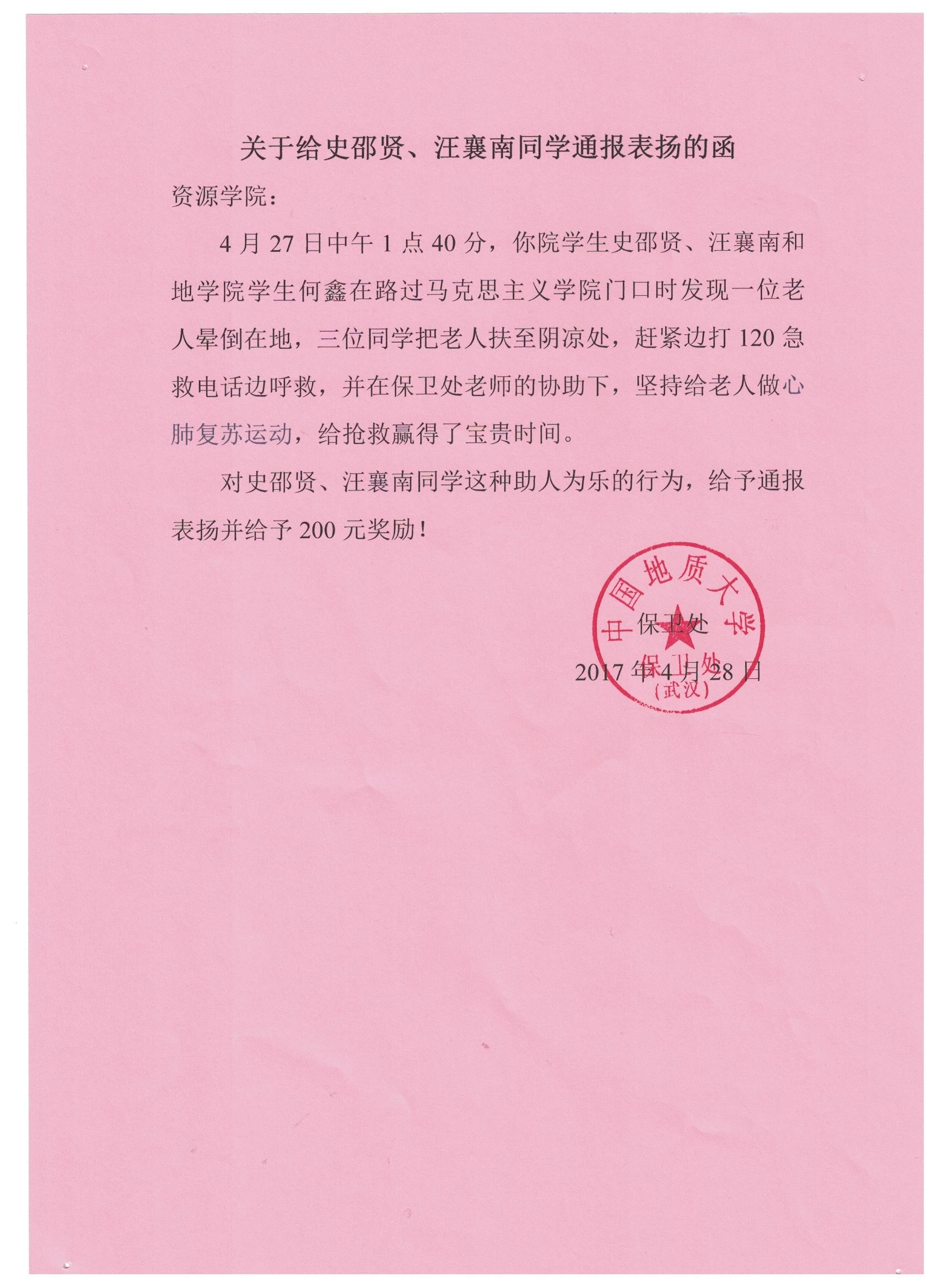 2017年4月27日13时40分,在路过马克思主义学院办公楼门口时,我院021133班学生史邵贤和021154班学生汪襄南以及地学院一名同学发现一位老人晕倒在地,当即把老人扶至阴凉处休息,并拨打120求救。在询问老人病情和家人信息时,老人突然再次昏迷,随后三名同学再次拨打120询问急救知识,在120指导下轮流进行心肺复苏,此时保卫处老师也及时赶到并联系校医院医生,14时05分,校医院医生赶来开展急救工作,经过多方人员近半个小时的努力,老人终于恢复心跳,随后被医护人员送往医院救治。