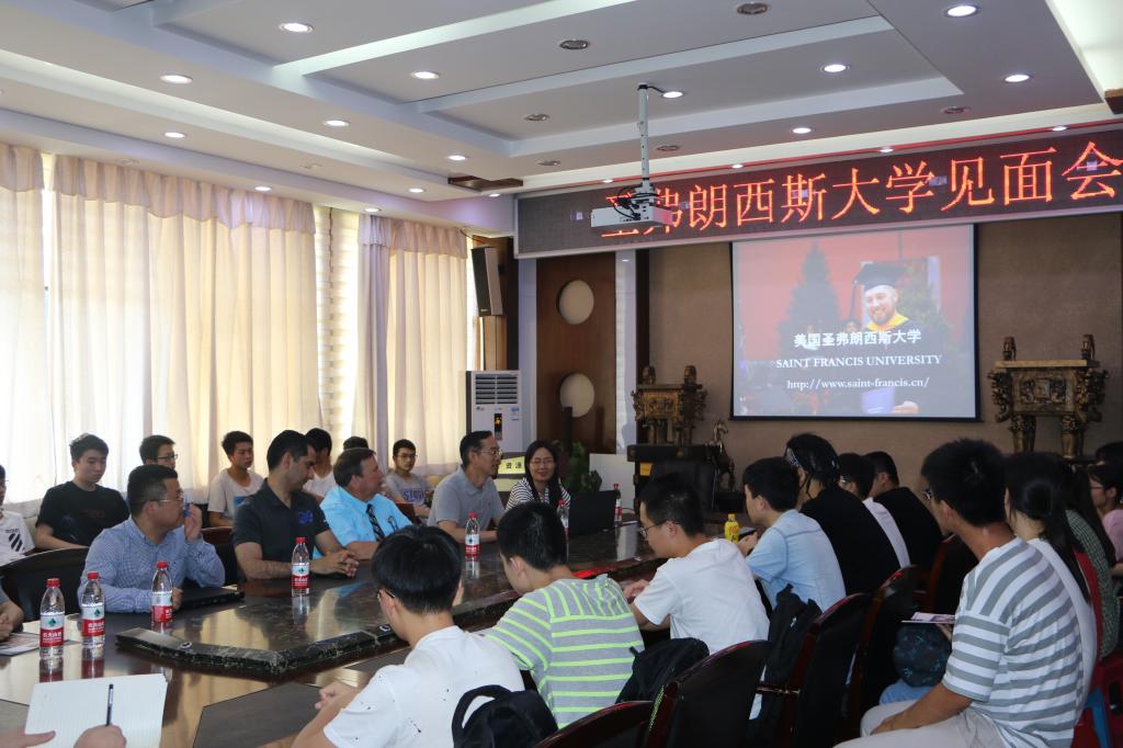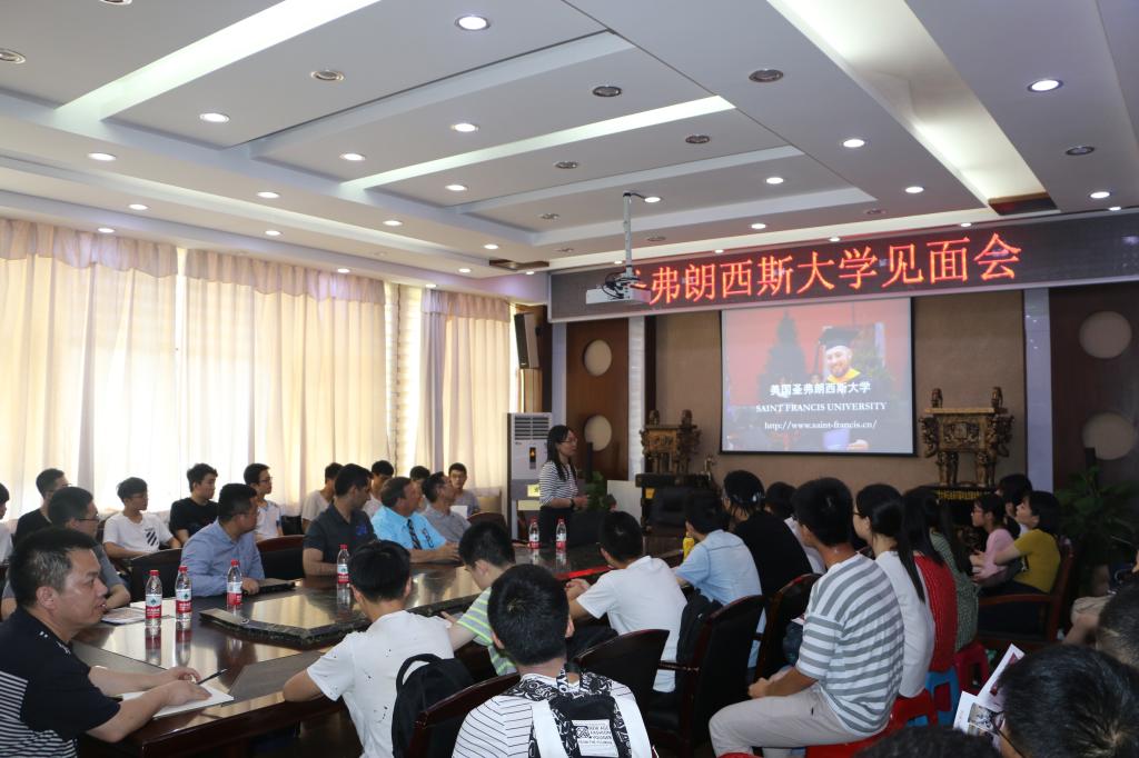 圣弗朗西斯大学何教授用中英文结合的方法从学校师资力量、人才培养、入学要求、学习费用、校园环境和社团活动等方面对学校进行介绍,并对学校小班制教学进行着重讲解。