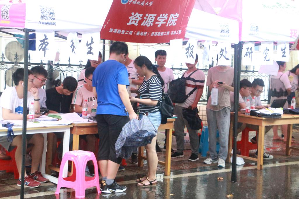 迎新工作早8点便拉开帷幕,各位志愿者一早便起来搬运迎新物资,赶在新生报道之前做好充足的准备,为新生的大学生活留下第一个美好的印象。10点左右突降大雨,但工作人员依旧坚持在新生到达的第一时间引导他们到迎新点进行报道,从简从速的办理新生手续,给新生及家长带去最大方便。