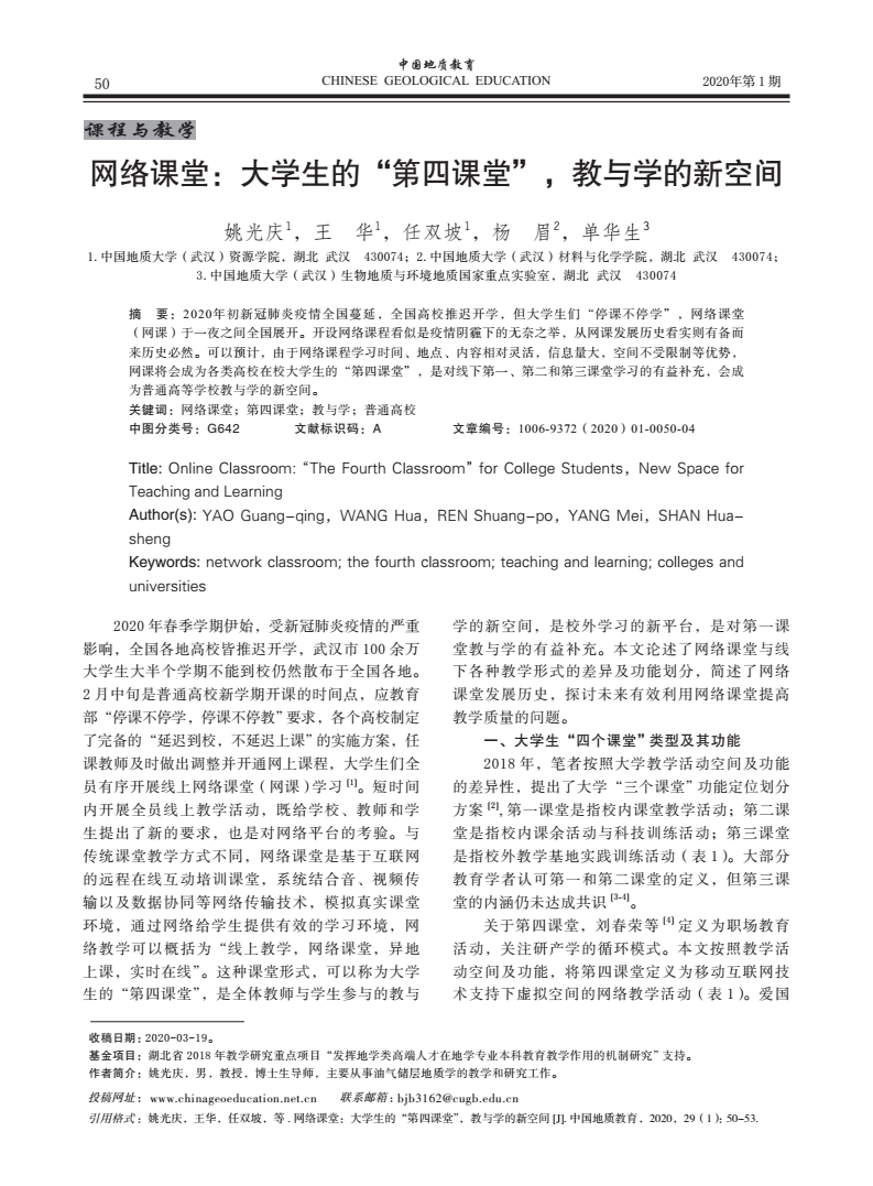 编者按:当前,新冠肺炎疫情蔓延势头得到有效遏制,防控工作取得阶段性成效,为深入贯彻落实习近平总书记关于统筹推进疫情防控和经济社会发展的系列重要讲话精神,在学校统一部署下,漫画18 全体教师克服重重困难,创新运用线上教学新形式,积极总结教学经验与成果。《线上教学进行时》第十期,让我们一同了解姚光庆,王华,任双坡等五位教师发表在《中国地质教育》期刊上的文章《网络课堂:大学生的“第四课堂”,教与学的新空间》。