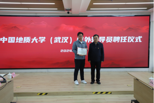 高复阳为地矿测绘院副总经理、大数据中心主任王明果校友颁发校外辅导员聘书。