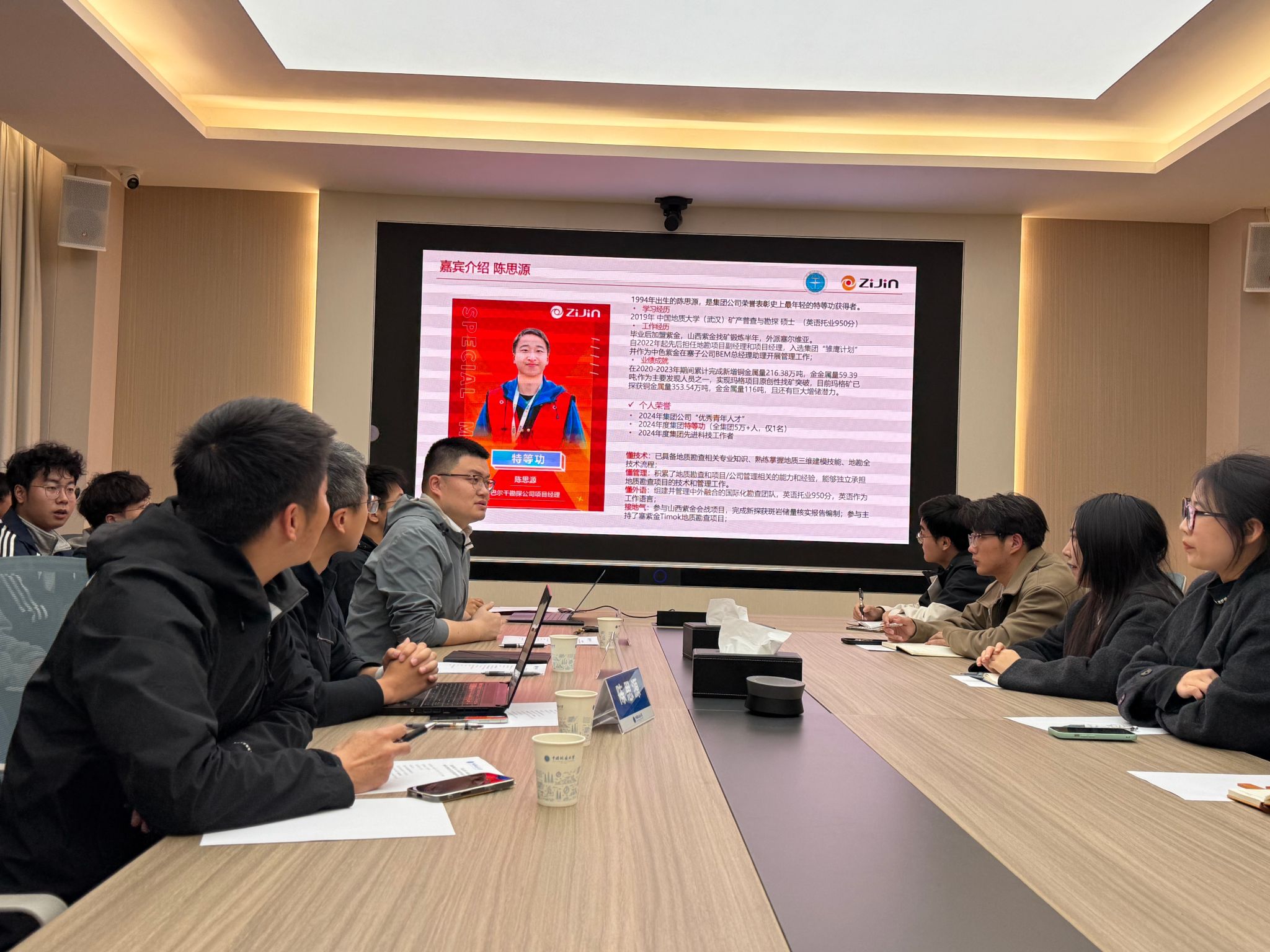 主题分享环节。陈思源结合在紫金矿业的职业成长历程与海外一线工作经历,围绕矿业行业全产业链体系、国内外发展现状、个人项目历练和国外找矿案例等方面作分享。他通过介绍紫金矿业、必和必拓、力拓3家国际矿业公司巨头在企业管理、战略布局、资本运作、社会责任等方面的差异,系统梳理国内外矿业行业发展现状。他回顾了自身从国内山西项目到塞尔维亚海外项目的成长经历,分享在海外坚守历练、参与玛格铜金矿床勘探发现的工作心得,对在校学子提出四点寄语:一是要“练好内功”,夯实专业基础,扎实的专业素养和能力终身受益;二是要“不务正业”,广泛涉猎跨学科知识,培养独立思考习惯,提升学习与问题分析能力;三是要“转变思维”,以积极主动的态度拥抱矿业行业国际化、数字化和多元化的发展趋势;四是要“与人为善”,尊重他人、真诚相待,学会换位思考,注重团队协作和跨文化沟通交流。
