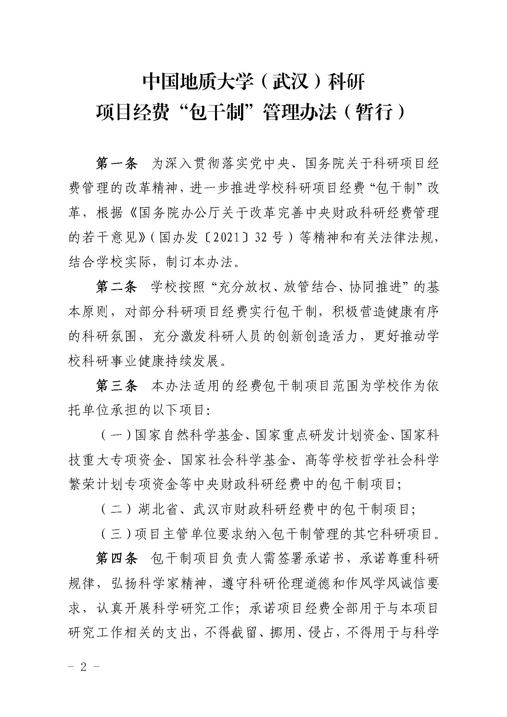中国地质大学(武汉)科研项目经费“包干制”管理办法(暂行)