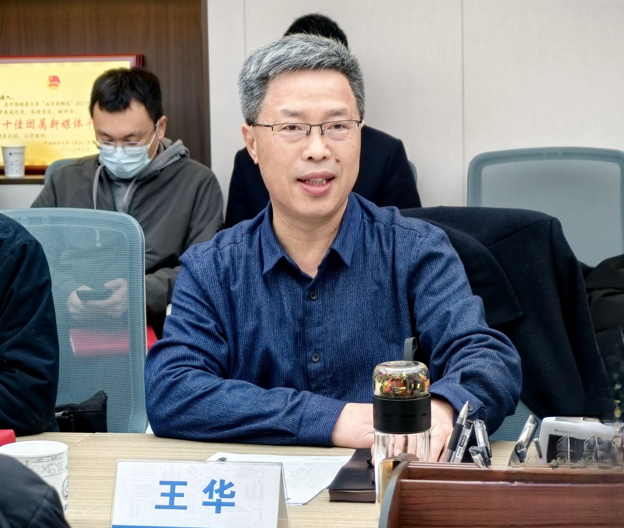 盆地矿产系主任甘华军介绍了盆地矿产系基本情况。他详细介绍了系师资力量、深部煤岩气勘探与开发科技成果、学科方向拓展、实验和实践平台等方面的情况。