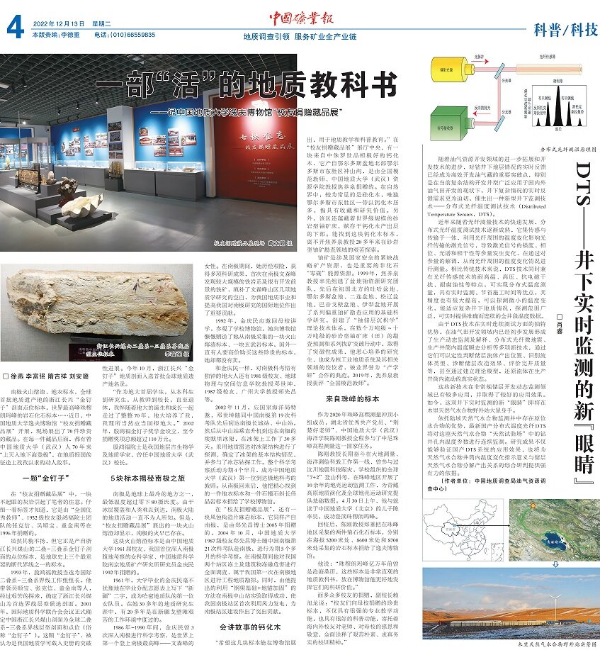 “希望这几块标本能在博物馆展出,用于地质教学和科普教育。”在“校友捐赠藏品展”展厅中央,有一块来自中侏罗世品相极好的钙化木,它产自鄂尔多斯盆地北部鄂尔多斯市东胜区神山沟,是由全国模范教师、中国地质大学(武汉)资源学院教授焦养泉捐赠的。在自然界中,较为常见的是硅化木,唯独鄂尔多斯市东胜区一带以钙化木居多,极具有收藏和研究价值。另外,该区还蕴藏着世界级规模的砂岩型铀矿床,赋存于钙化木产出层的下部。能找到这块钙化木标本,离不开焦养泉教授20多年来在砂岩型铀矿勘查领域的艰苦探索。