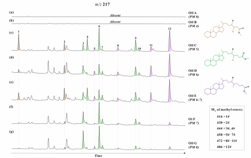 资源学院朱钢添副教授团队选取南襄盆地泌阳凹陷原油作为研究对象,通过气相色谱-质谱(GC-MS)、全二维气相色谱-飞行时间质谱(GC×GC/ToF-MS),系统分析了一系列母源关系接近但生物降解等级不同的原油样品中的甾烷酸分布。GC-MS分析结果表明,在未降解和低降解等级的原油样品中,未检出甾烷酸信号,只有在生物等级较高(规则甾烷开始发生明显降解)的原油样品中才能检测到甾烷酸,说明该类酸性生物标志物是甾烷的生物降解产物(图1)。