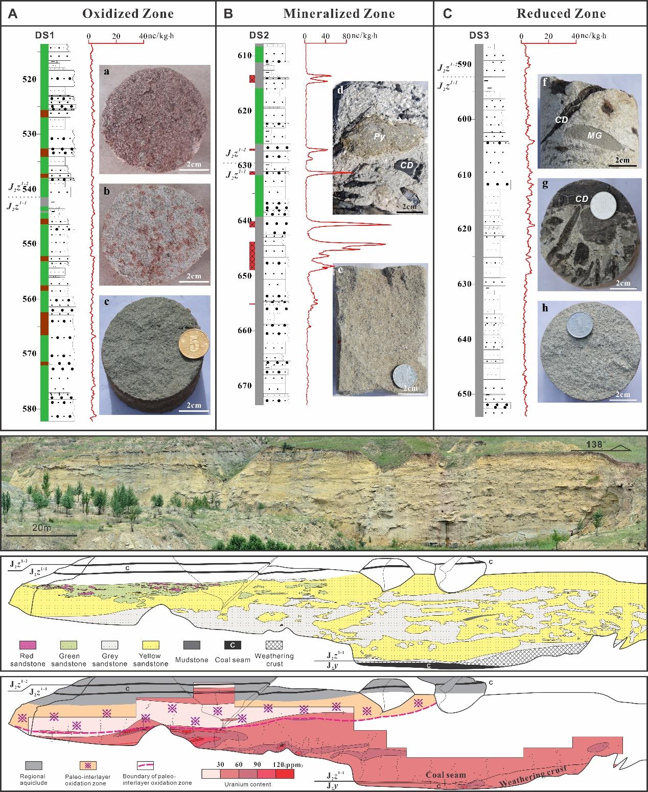 中国地质大学(武汉)资源学院焦养泉教授团队的博士后乐亮(合作导师:赵军红教授)选取我国北方最重要的产铀盆地之一——鄂尔多斯盆地的东胜铀矿田为研究对象,该矿田铀储层经历了复杂的流体事件,包括(1)层间氧化作用;(2)烃类流体二次还原作用;和(3)地表氧化作用。在细致的野外露头剖面写实与钻孔岩心编录基础上,结合环境敏感参数与微量U-Th测试,笔者重点对铀储层中不同岩石地球化学类型砂岩开展了微区矿物学与同位素地球化学分析,对氧化-还原微环境的变化和成矿过程进行了深入探讨,取得了如下主要认识: