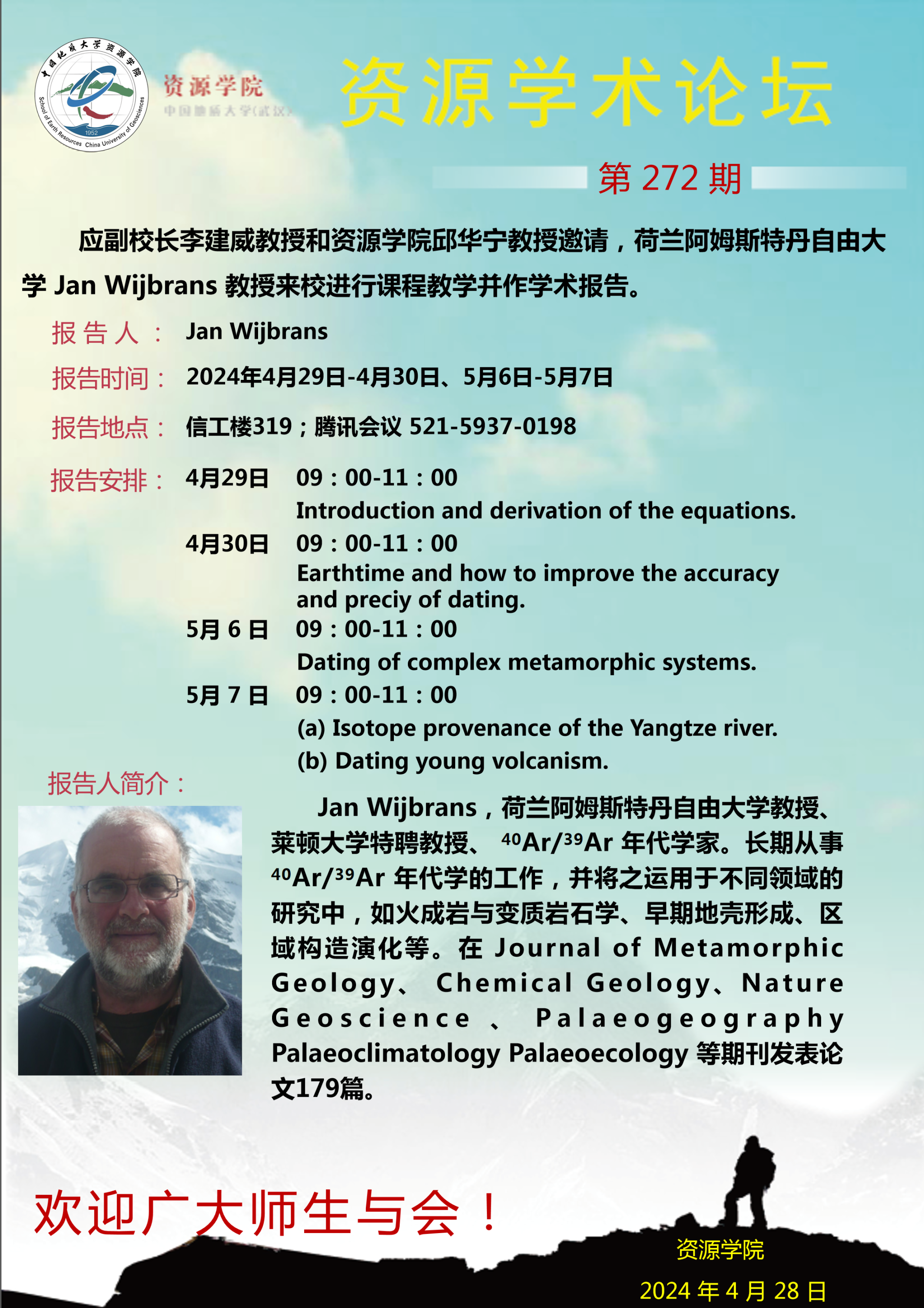 【4月29日-4月30日、5月6日-5月7日】第272期资源学术论坛:Jan Wijbrans学术报告