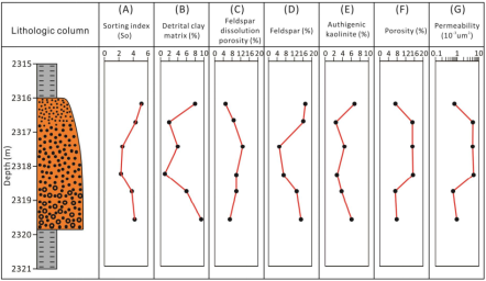 图3杭锦旗地区下石盒子组致密砂岩厚层砂岩中分选系数(A)、碎屑粘土基质(B)、长石溶蚀孔隙(C)、碎屑长石(D)、自生高岭石(E)、孔隙度(F)和渗透率(G)变化特征