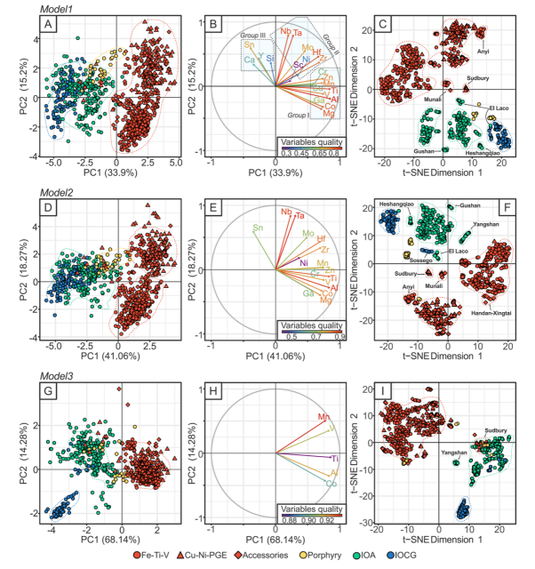 资源学院2021届硕士毕业生胡斌和博士后曾丽平,在导师赵新福教授指导下,收集了全球典型高温成矿系统,包括岩浆成因矿床(钒钛磁铁矿、铜镍硫化物矿床)、高温热液矿床(斑岩铜矿、IOCG矿床)、IOA矿床及相关的岩浆岩中已发表的原生高钛磁铁矿的LA-ICP-MS元素数据(图1),对数据集进行了两种无监督方法(主成分分析[PCA]和t分布随机邻域嵌入[t-SNE])的机器学习分析,通过大数据统计分析和建立机器学习模型,建立了不同成因高钛磁铁矿的微量元素组成特征。