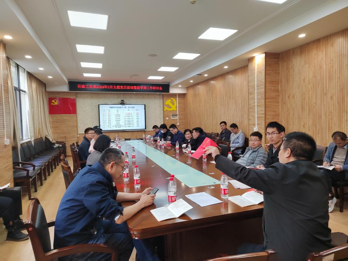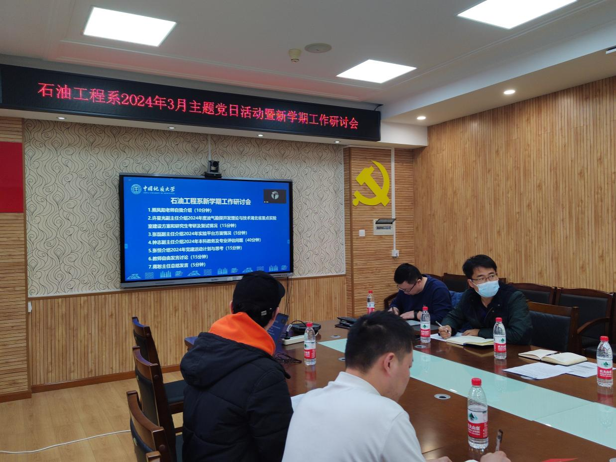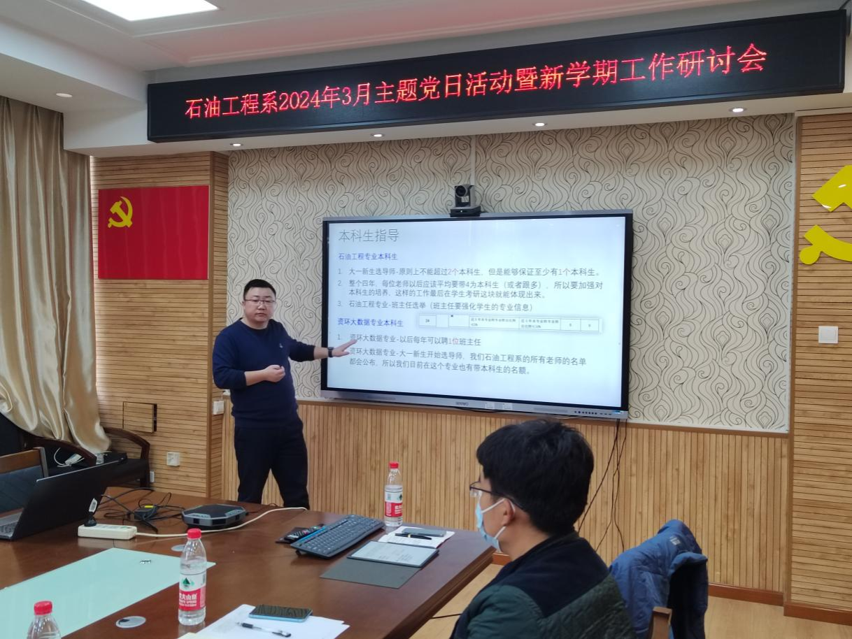 (通讯员 孙艳坤)3月28日,资源学院石油工程系党支部开展2024年3月主题党日活动和新学期工作研讨,会议主题为“学习全国两会精神,砥砺奋进担当作为——直面问题、勠力同心,推动石油工程学科建设”。石油工程系全体教师、学生党支部书记参加会议。支部书记张恒主持会议。