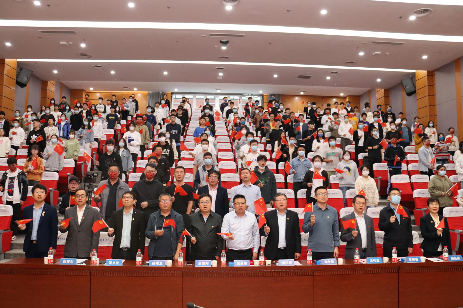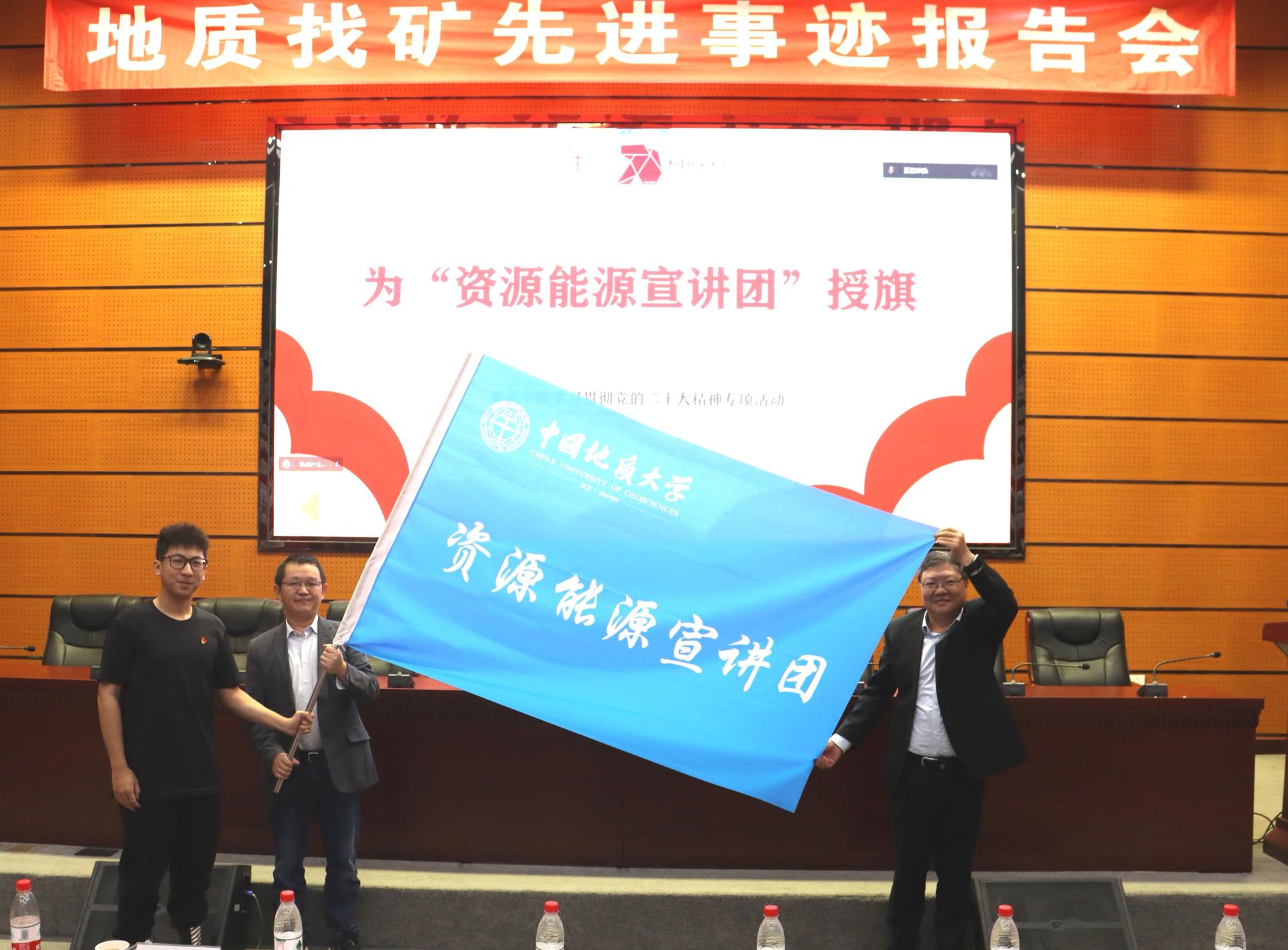 储祖旺为资源学院“资源能源宣讲团”授旗。武汉市委宣讲团成员、副院长沈传波教授,“志留纪”科普平台负责人、资源勘查工程专业2020级本科生吕骏腾代表接旗。