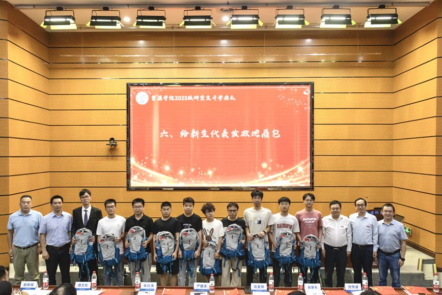 全体院领导为新生代表分发地质包。