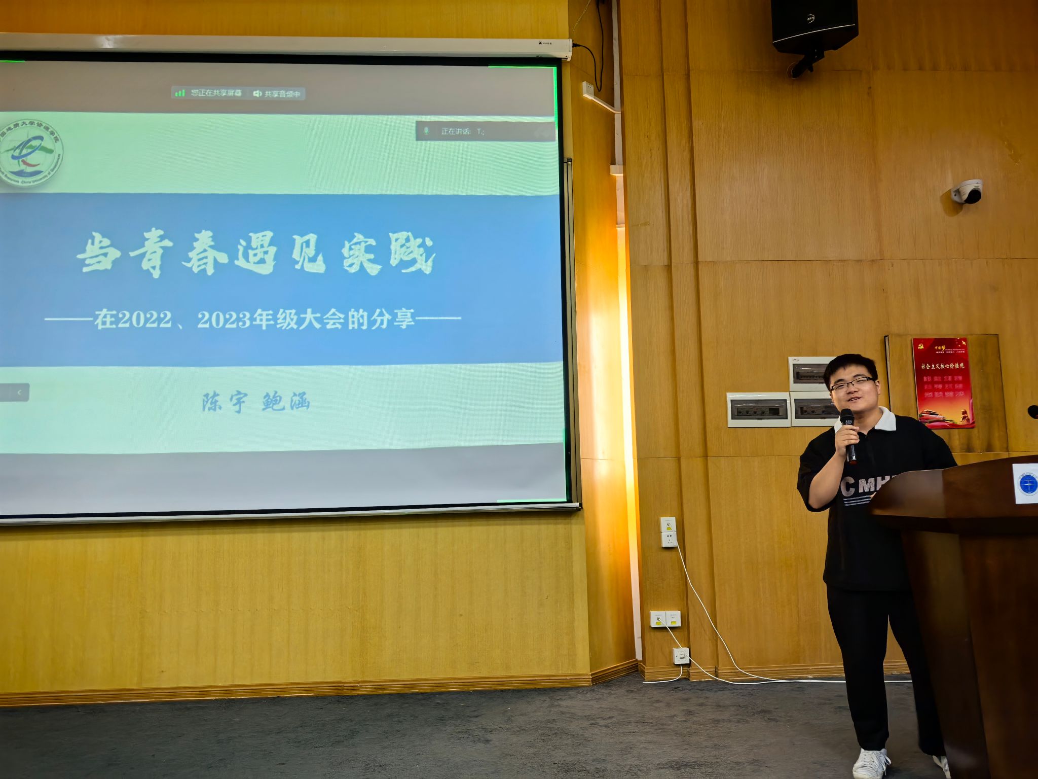 学校第26届研究生支教团成员、资源学院2024届毕业生代表陈宇作《当青春遇见实践》社会实践经验主题分享。他结合自身支教经历介绍了实践选题、实践步骤、实践成果及总结宣传等经验做法,并希望大家在实践中要涵养“自找苦吃”的精气神,肯吃苦、能吃苦,在调查中增长才干,在实践中磨炼意志。