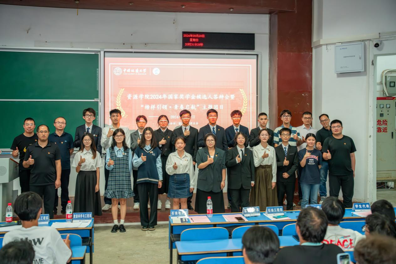 9月29日晚上,资源学院举行2024学年度国家奖学金候选人答辩会暨“榜样引领 青春领航”主题团日活动。16位国家奖学金候选人分别从思想品德、学业成绩、科研实践、志愿服务、社会实践等多方面进行展示,展现了资源学子求实进取、勇攀高峰的优秀品质和全面发展的综合素养,激励2024级资源新生在学业道路上凝聚力量,勇毅前行。