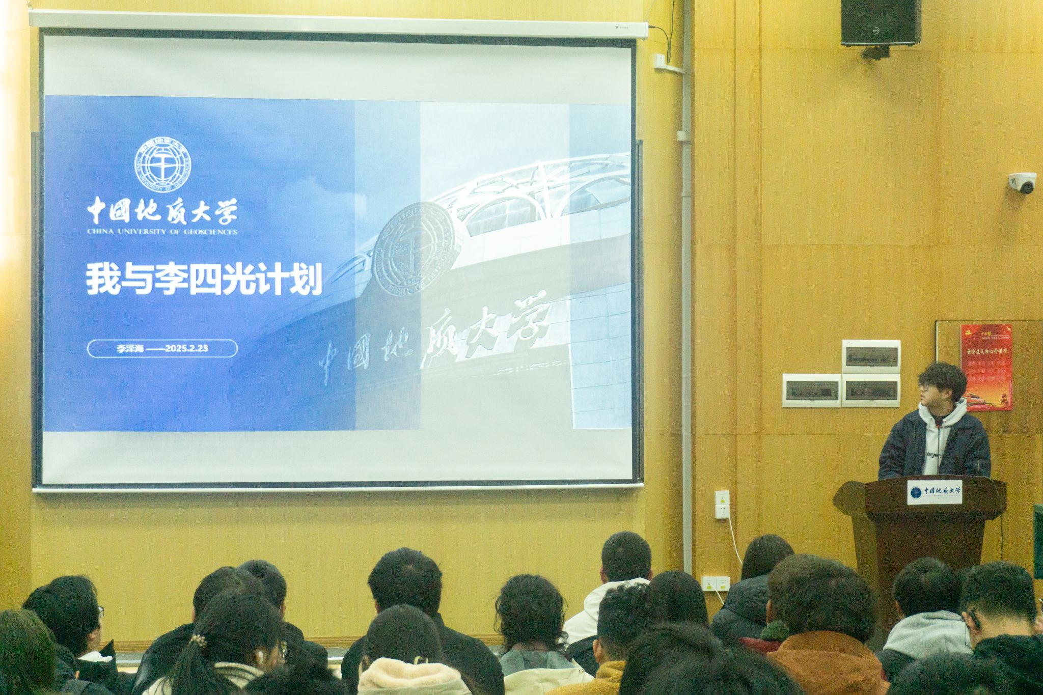 “学校李四光计划成员”、资源学院2023级本科生李泽海做《我与李四光计划》主题分享。他从自身成长、李四光计划介绍、学业建议三个方面全面介绍了李四光计划,并根据大一下学期的学情特点分享了学习心得与感悟。