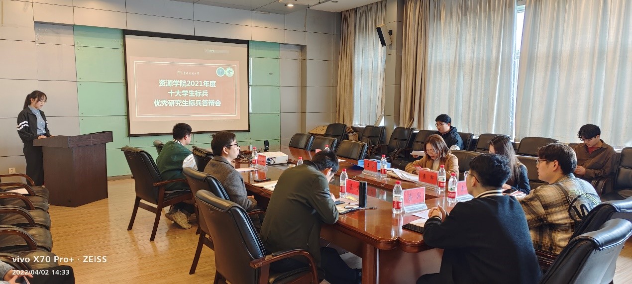 4月2日下午,资源学院2021年度十大学生标兵、研究生标兵答辩会在主楼930顺利举行。院党委副书记谭文伦老师、青年教师联合会代表陈思老师、院团委书记刘明辉老师、学工组霍少孟老师,以及本研学生代表徐振宇、吴永璞担任评委。组织部符亦飞主持会议。