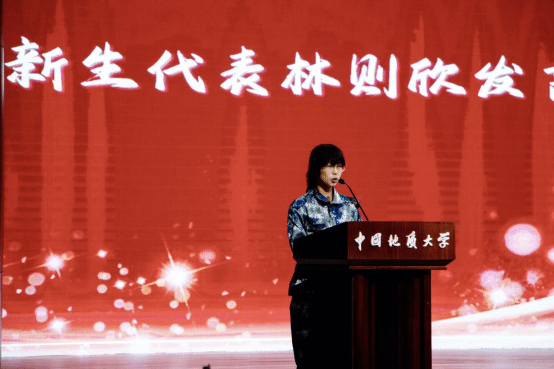 本科生新生代表林则欣发言。她提到自己坚定选择地大与资源学院,既有家族传承的影响,也有个人对资源领域的热爱与思考。她表示,学校 “艰苦朴素,求真务实” 的校训与个人理想高度契合,期待未来四年与同学们并肩同行,共同探索地球奥秘,在求知路上相互扶持、共同成长。
