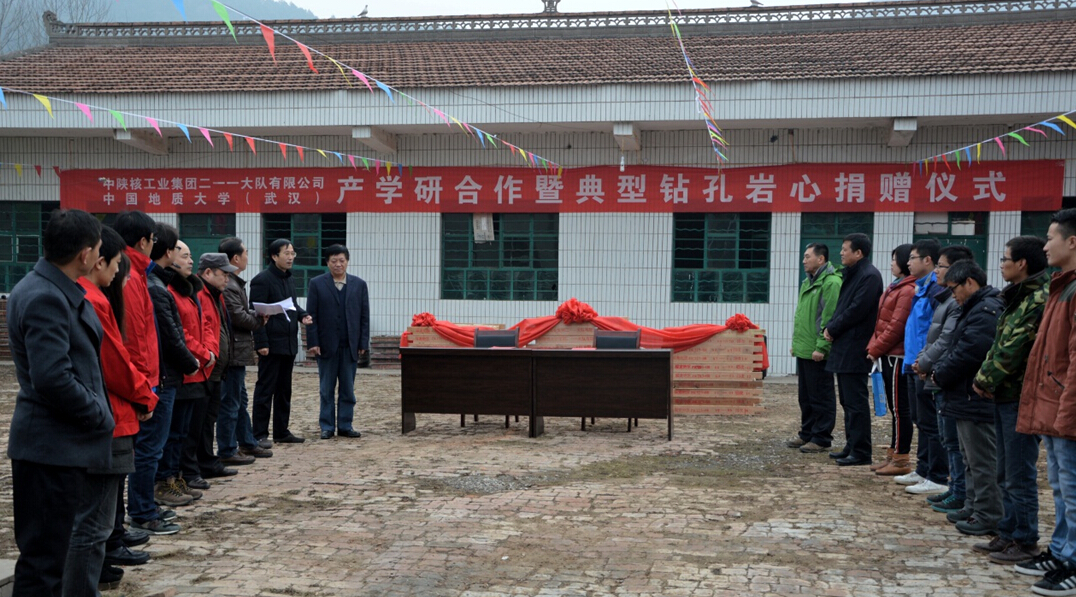 2015年12月8日,我校校友与社会合作处兰廷泽处长和资源学院石万忠副院长,率《聚煤盆地沉积学》和《含煤岩系伴生矿产》教学组核心成员,赴铀矿整装勘查区现场参加了简单的岩芯捐赠协议签字和交接仪式。期间,二一一大队王仲铎队长(兼总工)简要总结了与地大盆地铀资源研究团队的成功合作经历,充分肯定了我校在双龙铀矿找矿突破中所起到的重要科研支撑作用和对二一一大队一线工程技术人员的培养,他衷心祝愿中地大与二一一大队共建而相助,合作而共赢,发展而互撑,协同而共谋。兰廷泽处长代表学校签署了捐赠协议,并高度赞扬了二一一大队对学校教学实践、科研工作和学科建设等方面的大力支持。双方约定,将进一步加强合作,通过教学研究,像“考古”那样让“石头”会说话,让珍贵的岩芯标本发挥重要的教学实践功能。