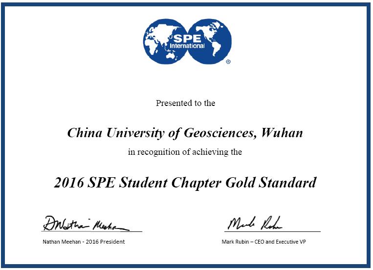 (通讯员 王向东)6月27日,从美国SPE总部(Society of Petroleum Engineers,国际石油工程师协会)传来喜讯,经过全球SPE总部的全面评定,特授予中国地质大学(武汉)SPE-CUG学生分会2016年度“Gold Standard”荣誉称号。此称号是该组织授予学生分会的最高荣誉。
